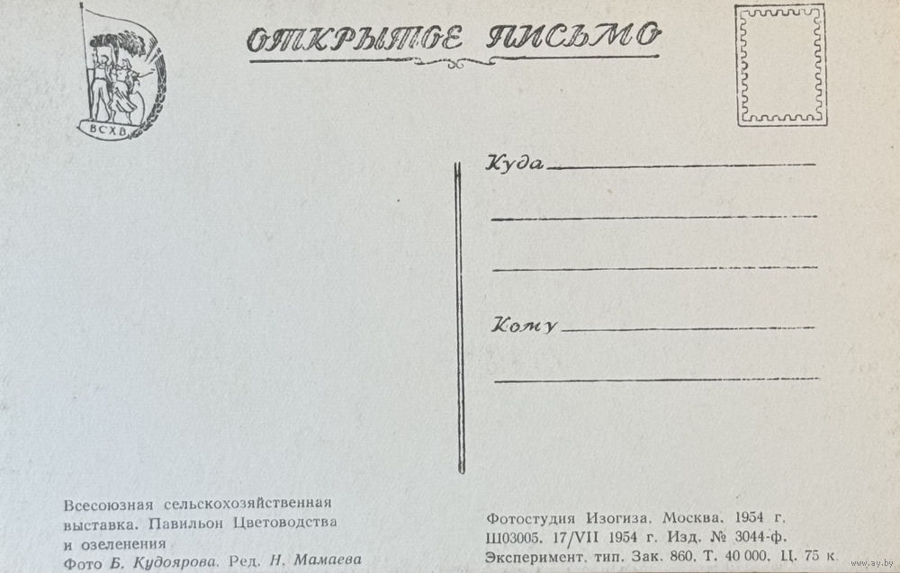 Открытое письмо Изогиз Всесоюзная сельскохозяйственная выставка Павильон Сибири 1954 тираж 40 000
