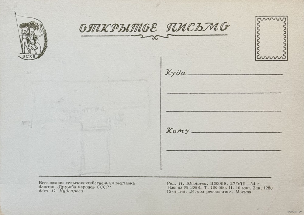 Открытое письмо Всесоюзная сельскохозяйственная выставка Фонтан Дружба народов СССР 1954