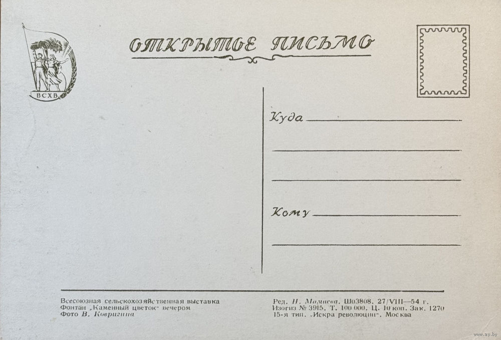 Открытое письмо Всесоюзная сельскохозяйственная выставка Фонтан Каменный цветок СССР 1954
