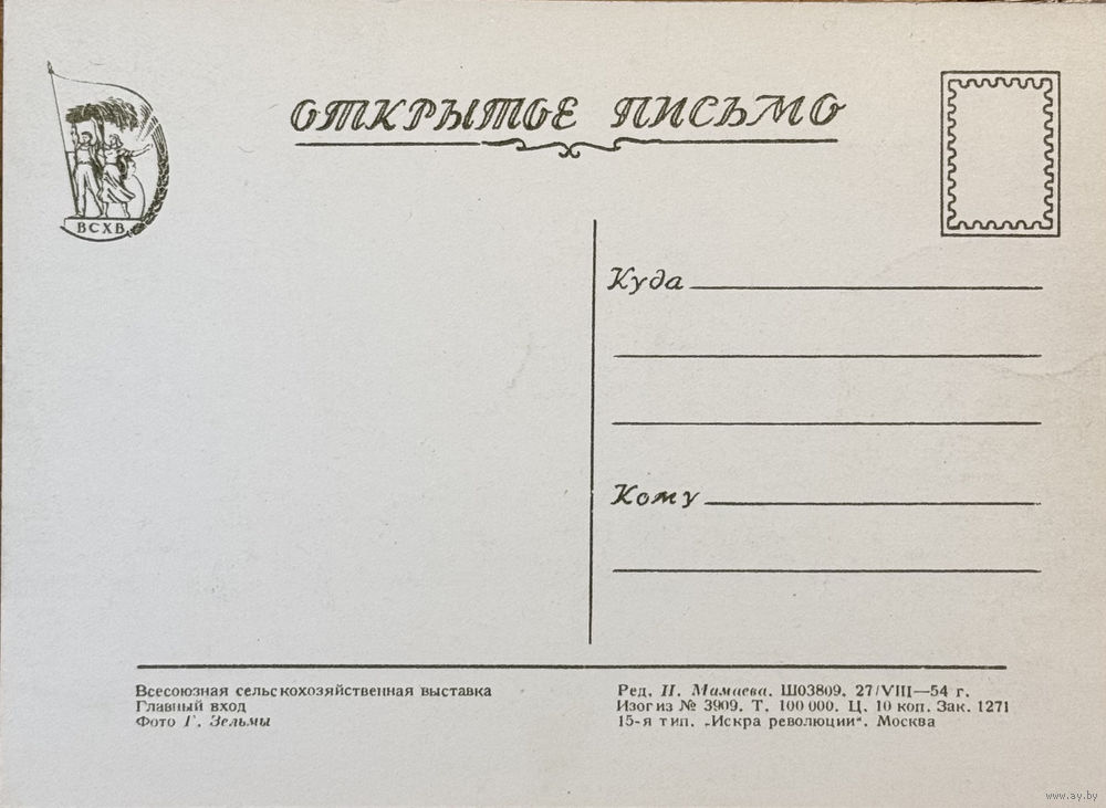 Открытое письмо Всесоюзная сельскохозяйственная выставка Главный вход 1954