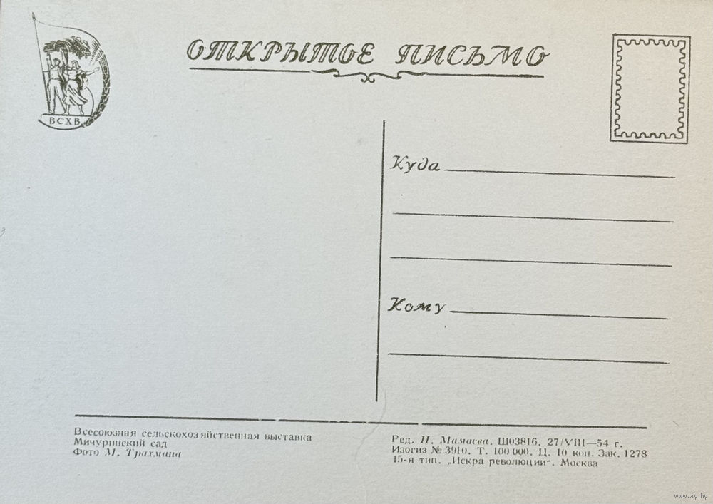 Открытое письмо Всесоюзная сельскохозяйственная выставка Мичуринский сад 1954