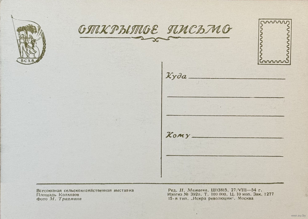 Открытое письмо Всесоюзная сельскохозяйственная выставка Площадь колхозов 1954