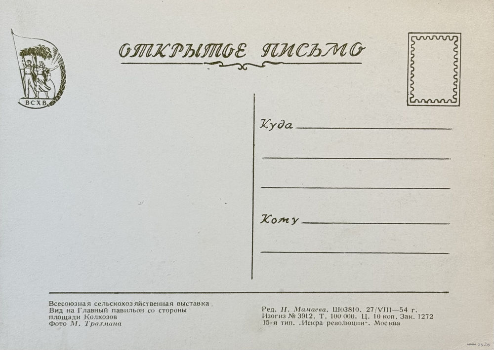 Открытое письмо Всесоюзная сельскохозяйственная выставка Вид на главный павильон 1954
