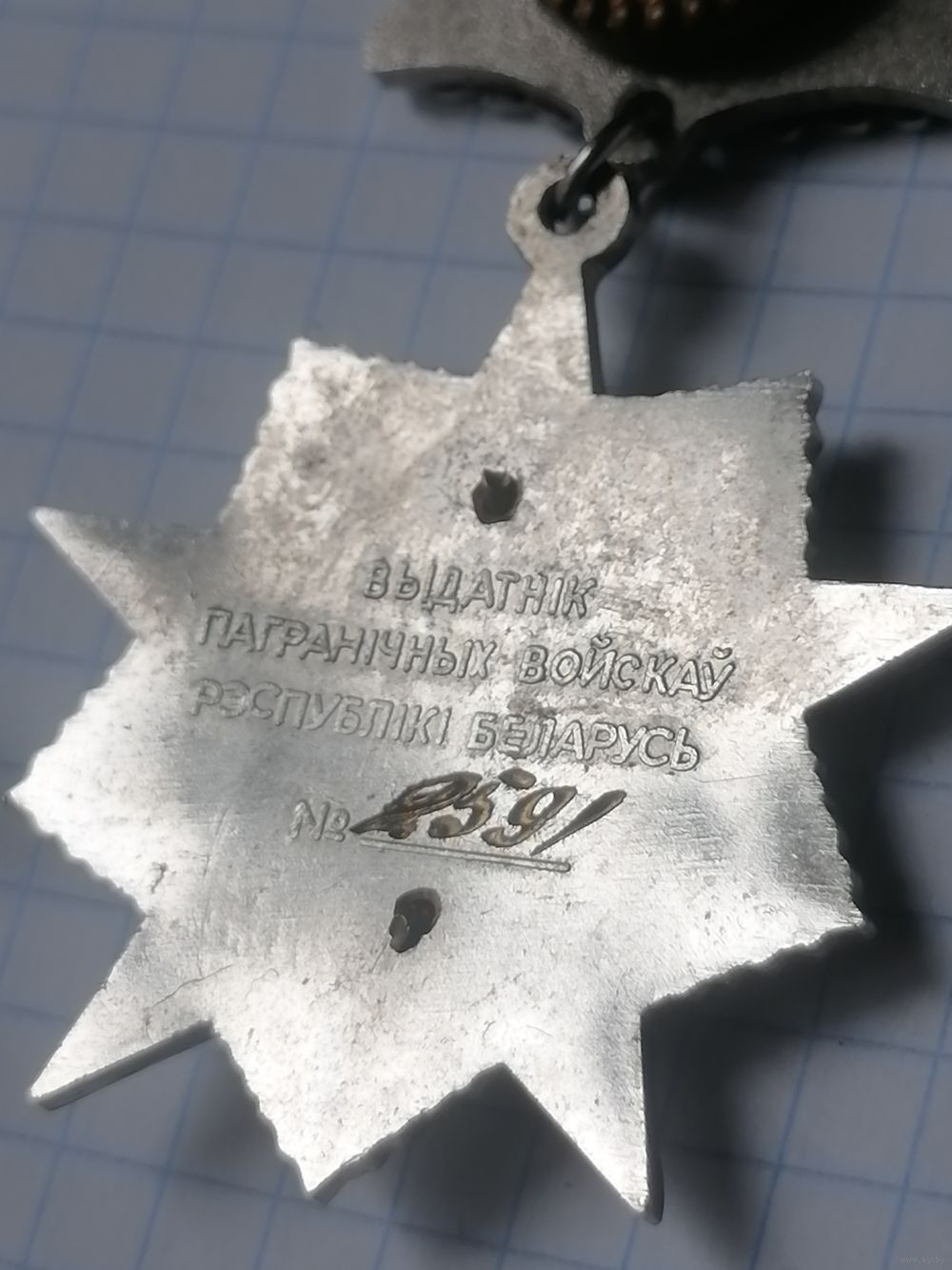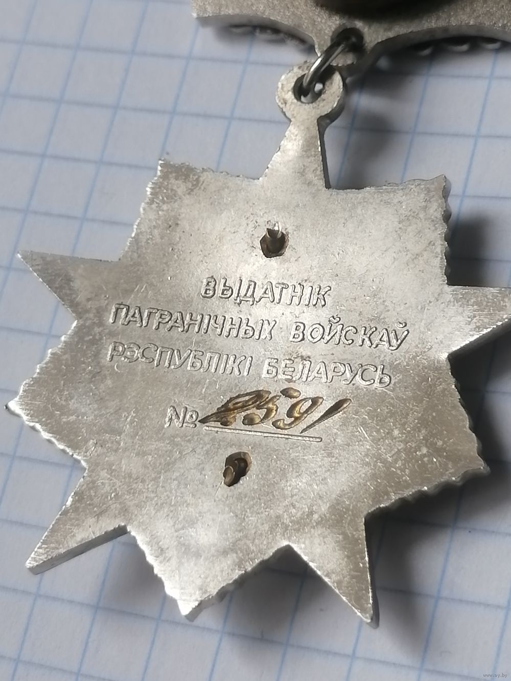 • Оборотная сторона нагрудного знака имеет гладкую поверхность, в верхней части ее находится надпись "Выдатнiк пагранiчных войскаў Рэспублiкi Беларусь" в три строки, в нижней - номер знака.