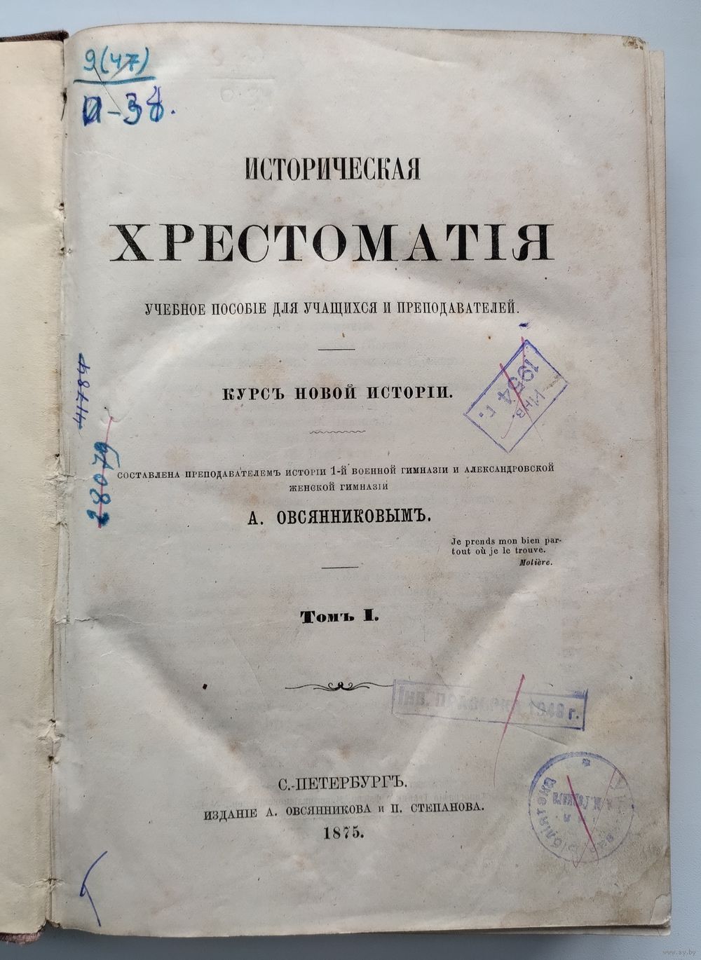 Овсянников А. Историческая хрестоматия (в двух томах). Том 1. Курс Новой истории. С.-Петербург. Издание А.Овсянникова и П.Степанова. 1875г., 764с. Старинный переплёт, обычный формат.