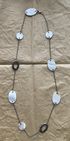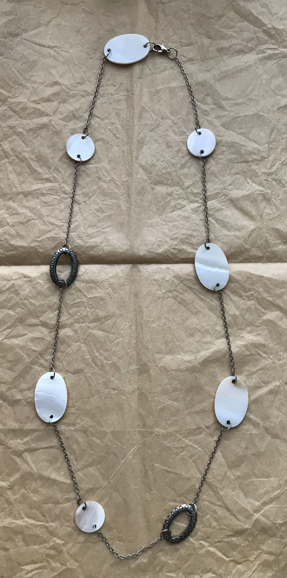 Ожерелье из металла серебристого тона и пластин из перламутра. Длина украшения 70см., диаметр круглых пластин 1,8см., размер овальных пластин 3х2см. Состояние хорошее.