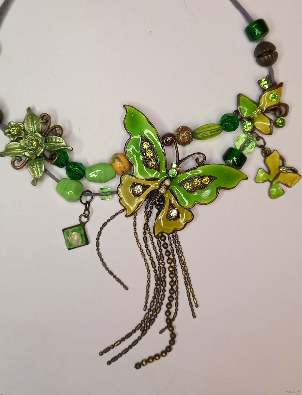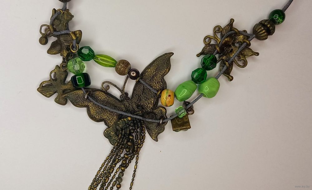 Очень красивое, необычное ожерелье в зеленых тонах с эмалью. Дл 49 см + удл цепочка, р-р центрального элемента-бабочки -6х4 см .