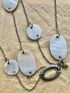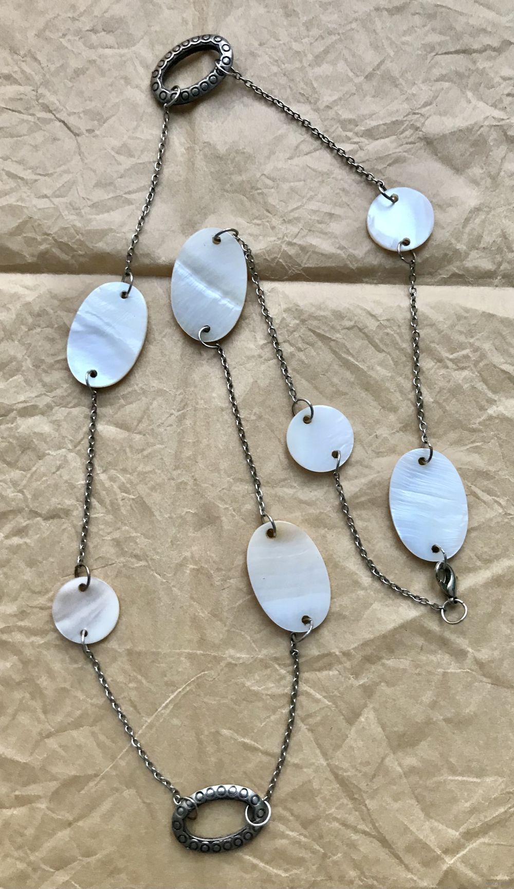 Ожерелье из металла серебристого тона и пластин из перламутра. Длина украшения 70см., диаметр круглых пластин 1,8см., размер овальных пластин 3х2см. Состояние хорошее.