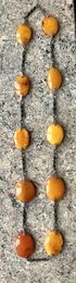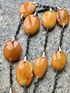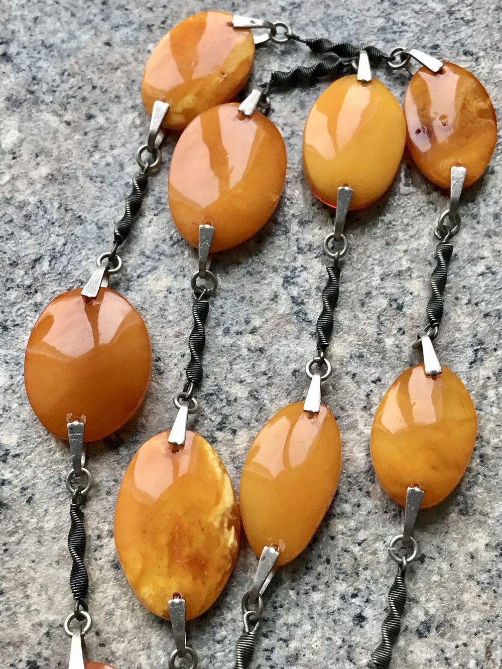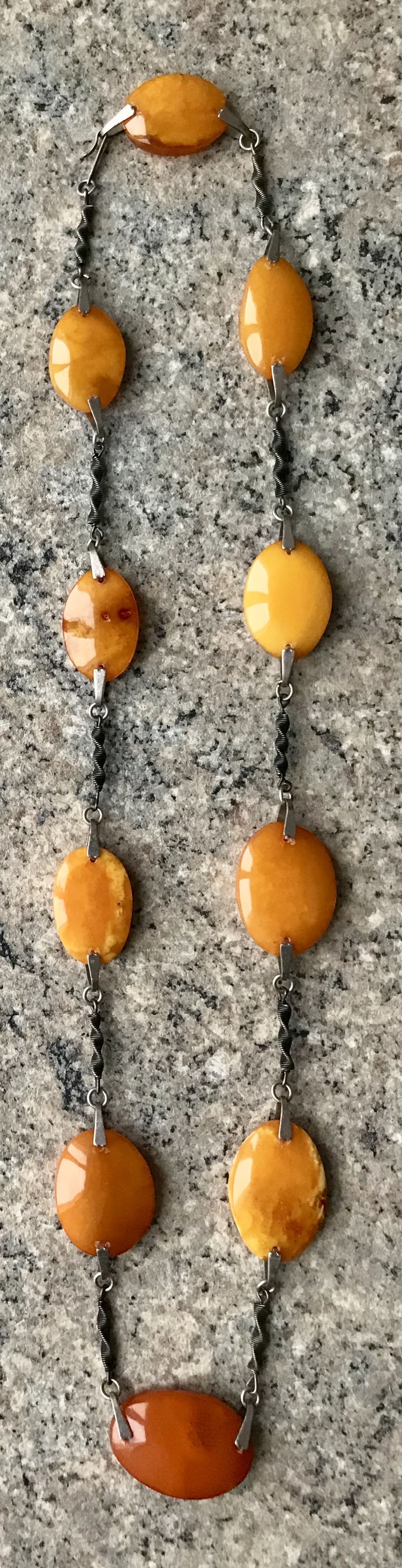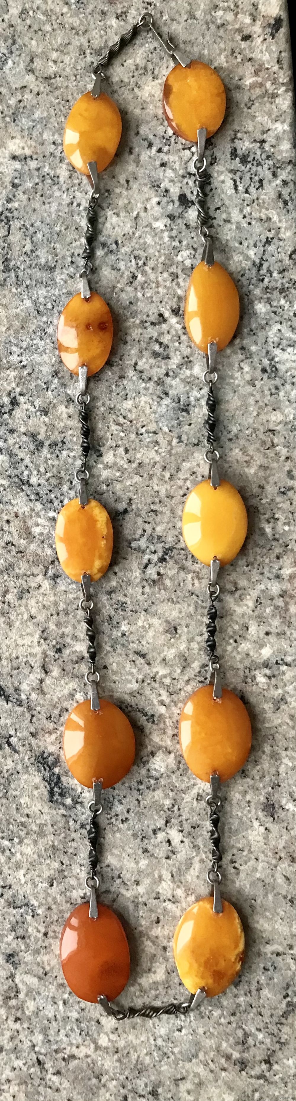 Эффектное ожерелье из мельхиора и пейзажного природного янтаря. Изготовлено в 1979г. в Калининграде (на застёжке стоит именник 9ЯК). Длина украшения 67см., размер янтаря от 2,6х1,8см. до 3х2,2см. Редко встречающаяся модель. Состояние хорошее.