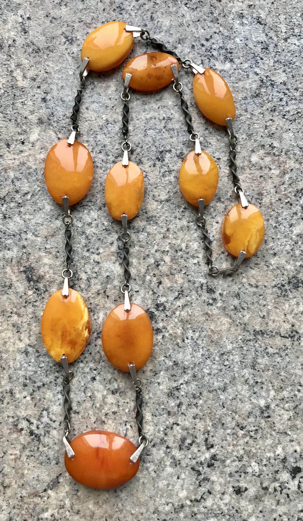Эффектное ожерелье из мельхиора и пейзажного природного янтаря. Изготовлено в 1979г. в Калининграде (на застёжке стоит именник 9ЯК). Длина украшения 67см., размер янтаря от 2,6х1,8см. до 3х2,2см. Редко встречающаяся модель. Состояние хорошее.