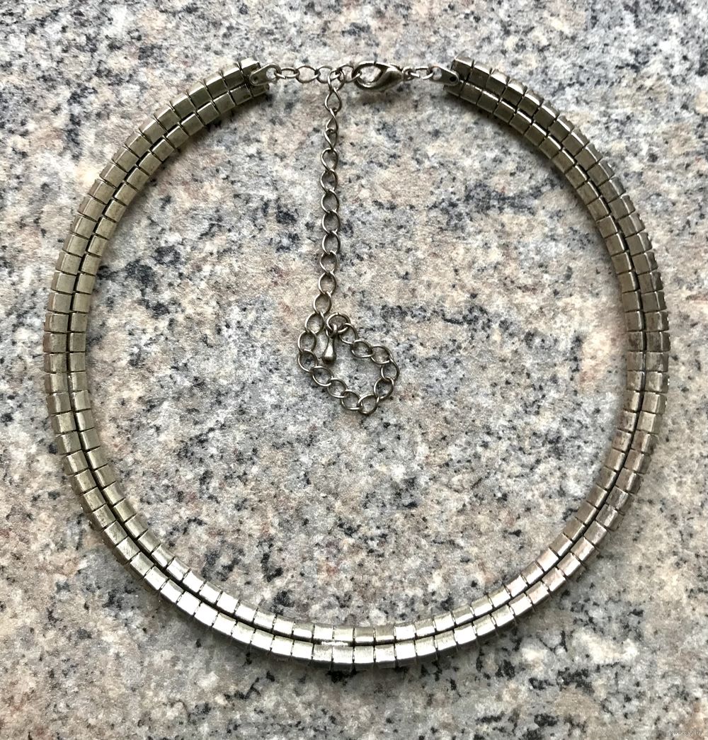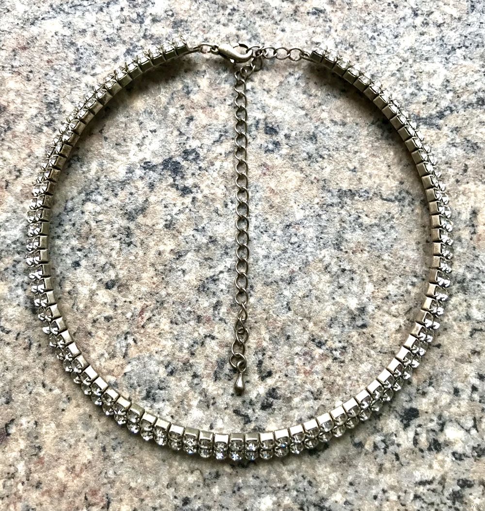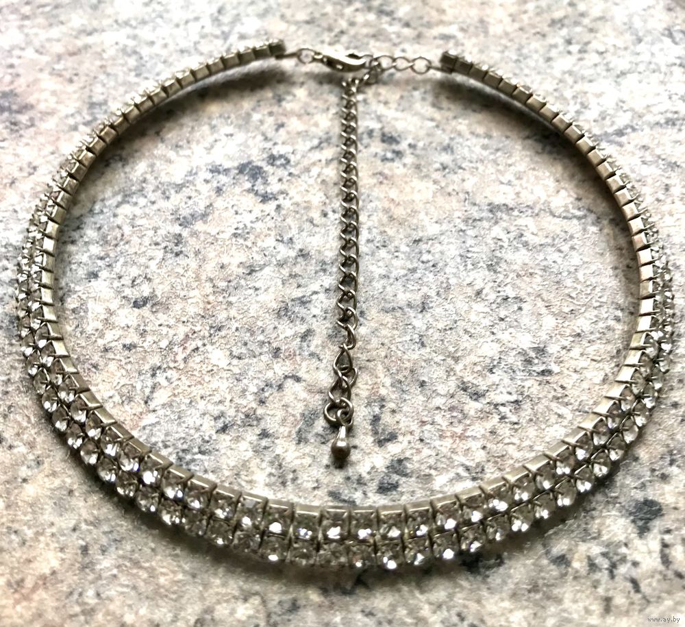 Ожерелье-чокер со вставками из кристаллов, каждый кристалл закреплён с четырёх сторон крапанами. Состояние хорошее.