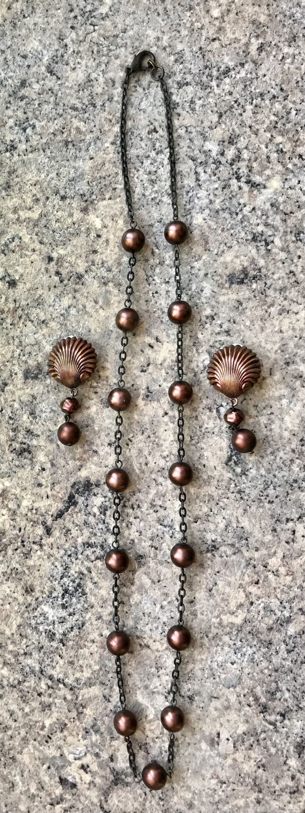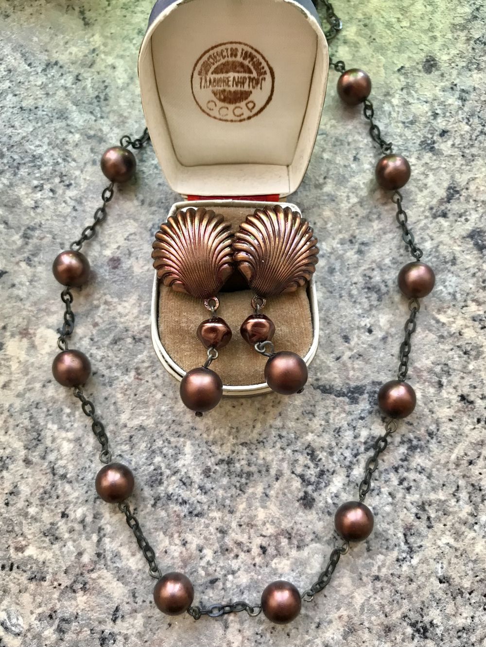 Винтажный комплект из металла и стекла. Длина бус 62см., диаметр бусины 1см., высота клипсы 5см. с висюлькой, размер ракушки 2,2х2см. Состояние хорошее.