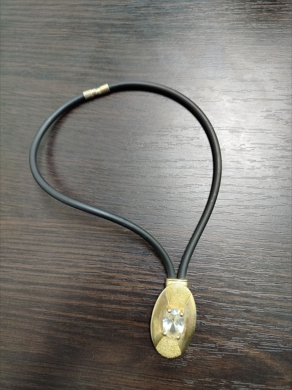 Ожерелье на черном резиновом шнурке с металлическим овалом по центру прозрачный камень из стекла подобие бриллианта , застежка на двух магнитиках .