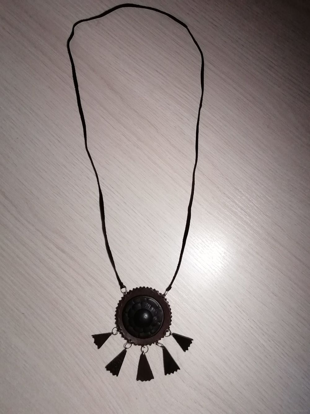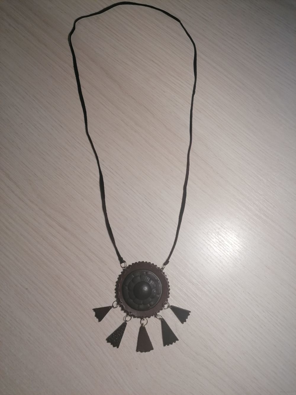 Этническое ожерелье выполнено из натуральной кожи коричневого цвета разных оттенков. Представляет собой кожаный диск на шнурке, на который прикреплена вставка в виде цветка. Дополнено кожаными резными треугольниками с бронзовыми кольцами. Диаметр диска 5,5 см; длина ожерелья 45 см.
