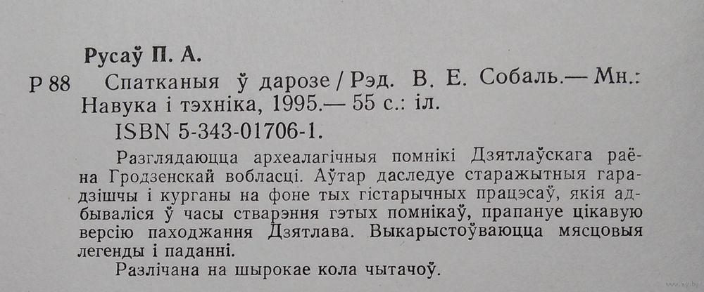 П. А. Русаў. Спатканыя ў дарозе: пра археалагічныя помнікі Дзятлаўскага раёна Гродзенскай вобласці. Мінск : Навука і тэхніка, 1995 г. 53 с. Мяккая вокладка.