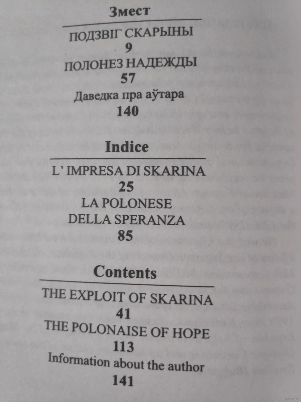 Кніга складаецца з 2 разделаў. Першы, «Подзвіг Скарыны», прысвечаны адкрыццю мемарыяльнай дошкі ў Падуанскім універсітэце ў гонар заснавальніка ўсходнеславянскага кнігадрукавання Ф. Скарыньі. Менавіта тут наш вялікі зямляк бліскуча вьтрымаў экзамен і атрымаў дыплом доктара медыцыны. Другі раздел, "Полонез Надежды", прьісвечаны ўшанашнню памяті Міхаіла Агінскага ў Фларэнцыі, дзе ён пражыў апошнія гады свайго жыцця і дзе спачывае яго прах (пантэон Санта Крочэ). Для масавага чытача.