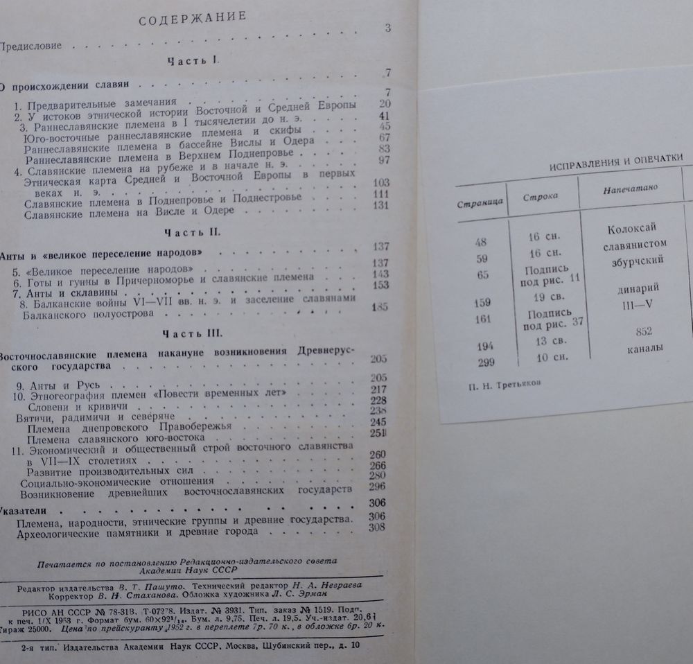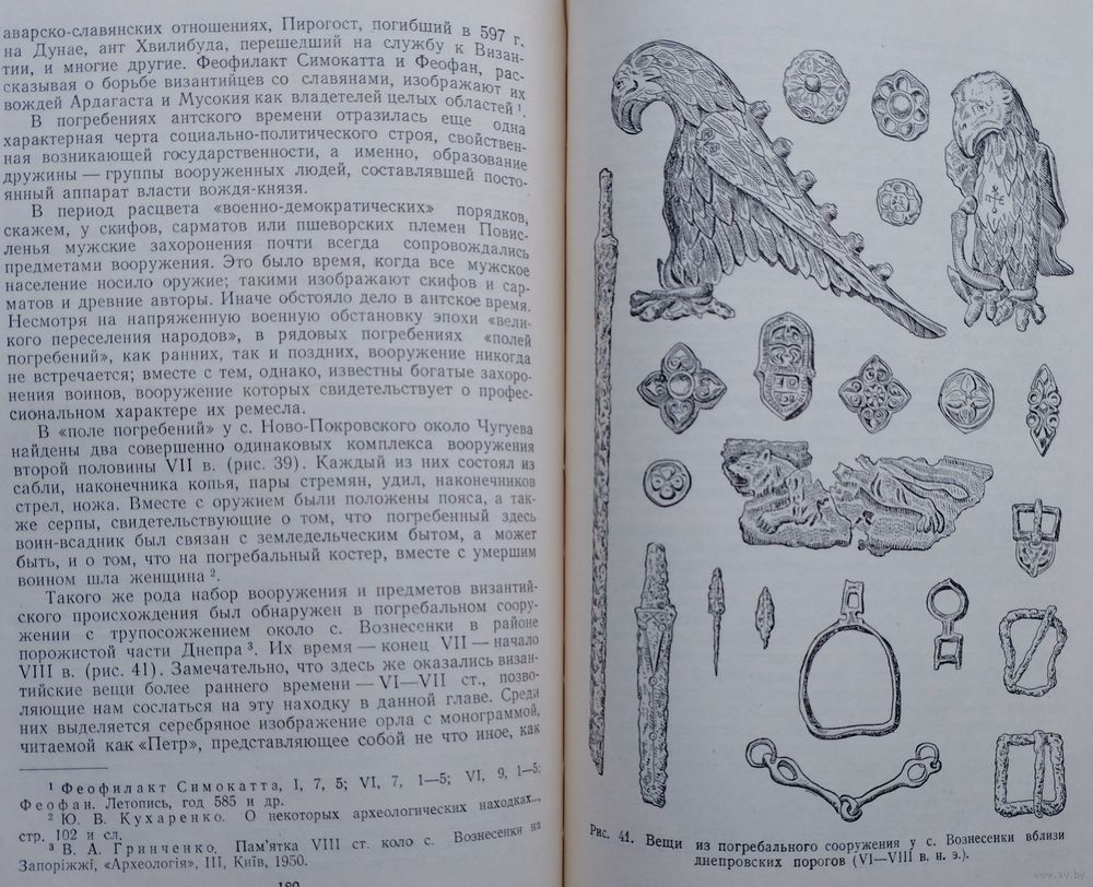 Большой формат. Тираж 25000 экз. 316 стр. Настоящая книга посвящена одному из важнейших вопросов древней и раннесредневековой истории СССР — историческим судьбам восточнославянских племен, предков русского, украинского и белорусского народов. В первой части книги сделана попытка обрисовать еще далеко не решенный вопрос о происхождении славян и наметить главные вехи их истории в период господства в Средней и Восточной Европе первобытно-общинного строя. Во второй части книги характеризуется жизнь восточных славян в середине I тысячелетия н. э., когда они под именем антов впервые выступили на европейской исторической сцене как активная и мощная политическая сила. Это было время распада первобытно-общинного строя у славянских и других европейских племен и вместе с тем — время их борьбы с рабовладельческими государствами Средиземноморья и Причерноморья, завершившейся крушением рабовладельческих порядков на европейском Юге. Последняя часть книги посвящена вопросам истории и истории культуры восточнославянских племен накануне возникновения Древнерусского государства, когда в их среде складывались феодальные отношения и первые государственные объединения.