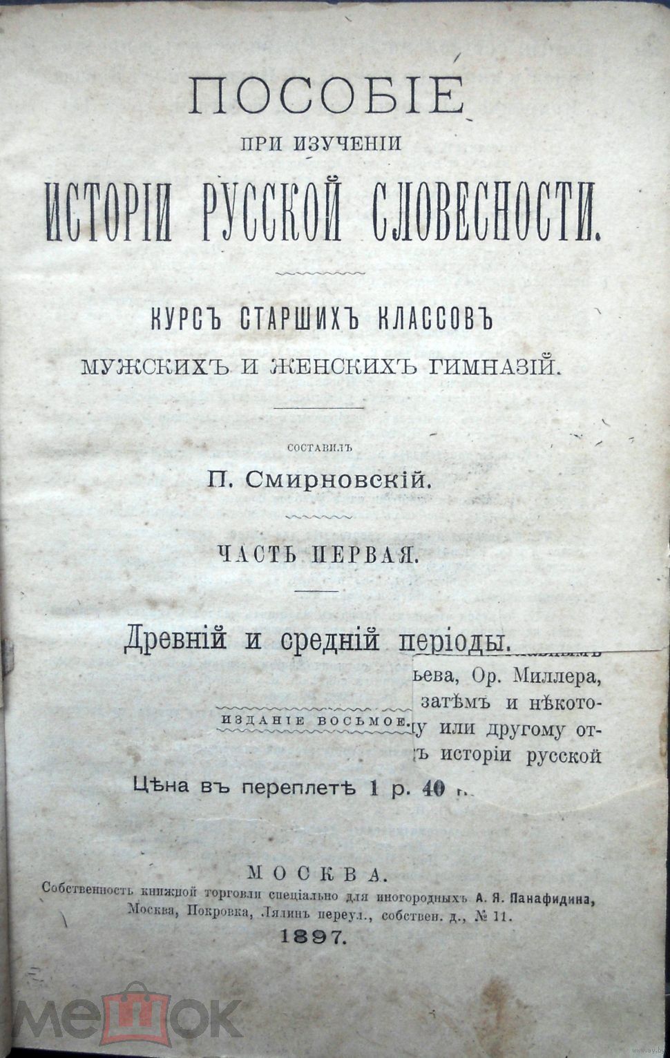 (Для средних учебных заведений). Часть 1-я. Курс старших классов мужских женских гимназий. Древний и средний период. Изд А.С.Панафидиной. 1897 г. 380 с. 22х15 см. Титульный лист с небольшой потерей. Полукожаный переплет с утратами корешка. «Лисьи пятна», один лист с утратами без потери текста. Забирать в центре, можно передать через турникет метро. Белпочта, Европочта, наложенный платеж