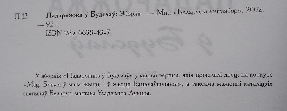 Падарожжа ў Будслаў: Зб. вершаў, якія праыслалі дзеці на конкурс "Маці Божая ў маім жыцці і ў жыцці Бацькаўшчыны". Мастак У.Лукша. Мн. : МГА "Беларускі кнігазбор", 2002 г. 91 c. Мяккая вокладка.