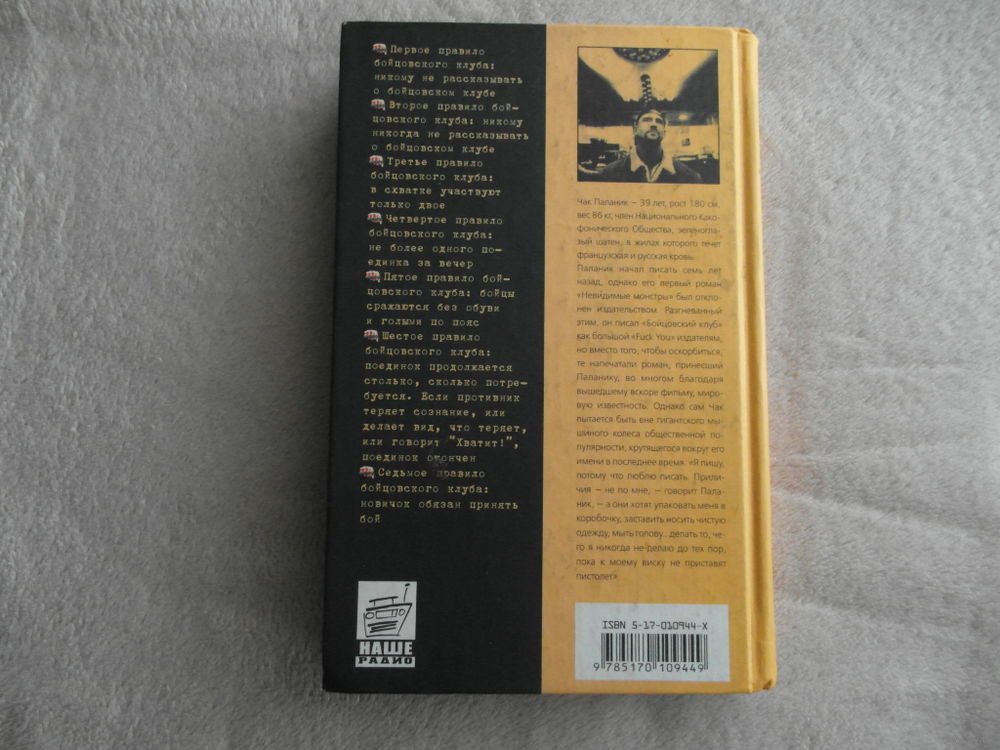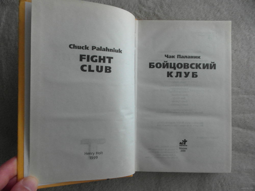 Чарльз Майкл (Чак) Паланик (англ. Charles Michael «Chuck» Palahniuk, род. 21 февраля 1962, Песко, Вашингтон, США) — современный американский писатель и фриланс-журналист. Известен как автор отмеченной множеством премий книги «Бойцовский клуб», по которой Дэвидом Финчером был снят одноименный фильм с Брэдом Питтом, Эдвардом Нортоном и Хеленой Бонэм Картер в главных ролях. Паланик имеет одно из самых многочисленных сообществ последователей в Интернете, которое создано на его официальном сайте. Творчество Паланика, схожее со стилем таких писателей, как Брет Истон Эллис, Ирвин Уэлш и Дуглас Коупленд, сделало его одним из самых популярных новеллистов Поколения X. «Бойцовский клуб» (англ. Fight Club) — роман, выпущенный в 1996 году в США издательством «W. W. Norton & Company». В центре сюжета находится герой, страдающий бессонницей, которая вызвана неприятием общества потребления. Также причиной его недуга является недовольство тем, как понимается мужественность в американской культуре. Следуя совету своего доктора, он начинает посещать группы поддержки для больных различными заболеваниями, вследствие чего бессонница отступает. Но через некоторое время такой способ перестает действовать. В процессе дальнейшей борьбы с этим герой встречает таинственного человека по имени Тайлер Дерден и создает подпольный бойцовский клуб как радикальную форму психотерапии. К написанию романа Паланика вдохновила драка, в которой он участвовал во время поездки в летний лагерь. Несмотря на то, что у него были ушибы и синяки, его коллеги предпочли не спрашивать, что с ним произошло в поездке. Именно их нежелание знать, что случилось, вдохновило писателя на написание романа «Бойцовский клуб». «Бойцовский клуб» был переиздан в 1999 и 2004 годах. Последний выпуск включал в себя предисловие автора про успех самого романа и его экранизации. Автор объяснил успех так: «Книжные магазины были заполнены такими книгами как „Клуб радости и удачи“, „Божественные тайны сестричек Я-Я“ и „Лоскутное одеяло“. Все эти романы представили социальную модель для женщин. Но не было романов, которые представили бы новую социальную модель для мужчин». Позже он пояснил: «В действительности то, что я написал, было просто немного обновленным романом „Великий Гэтсби“. Это был „апостольский“ роман — где выживающий апостол рассказывает историю своего героя. Есть двое мужчин и женщина. И один мужчина, герой, погибает от пули». Википедия сообщает, что впервые книга выпущена на русском языке издательством АСТ в 2002 году, однако в этом издании стоит еще более ранняя дата - 2001, год начала выпуска серии Альтернатива, закрытой в настоящий момент.