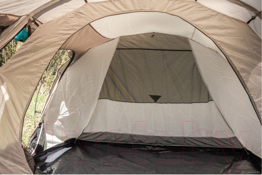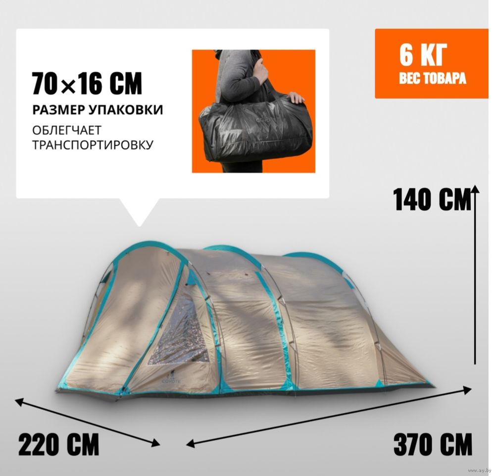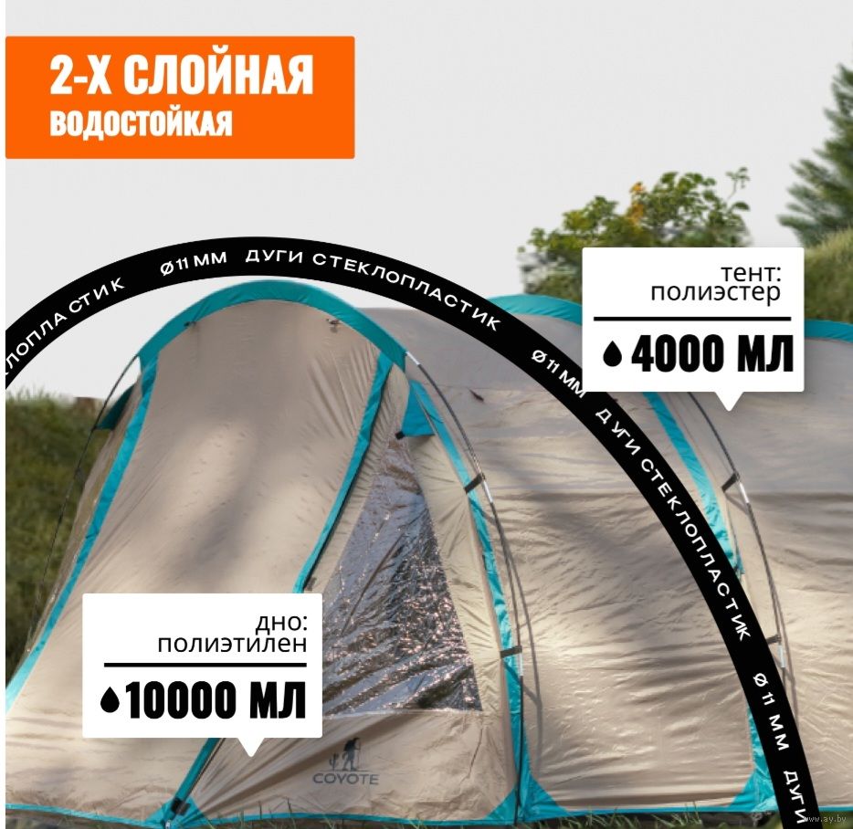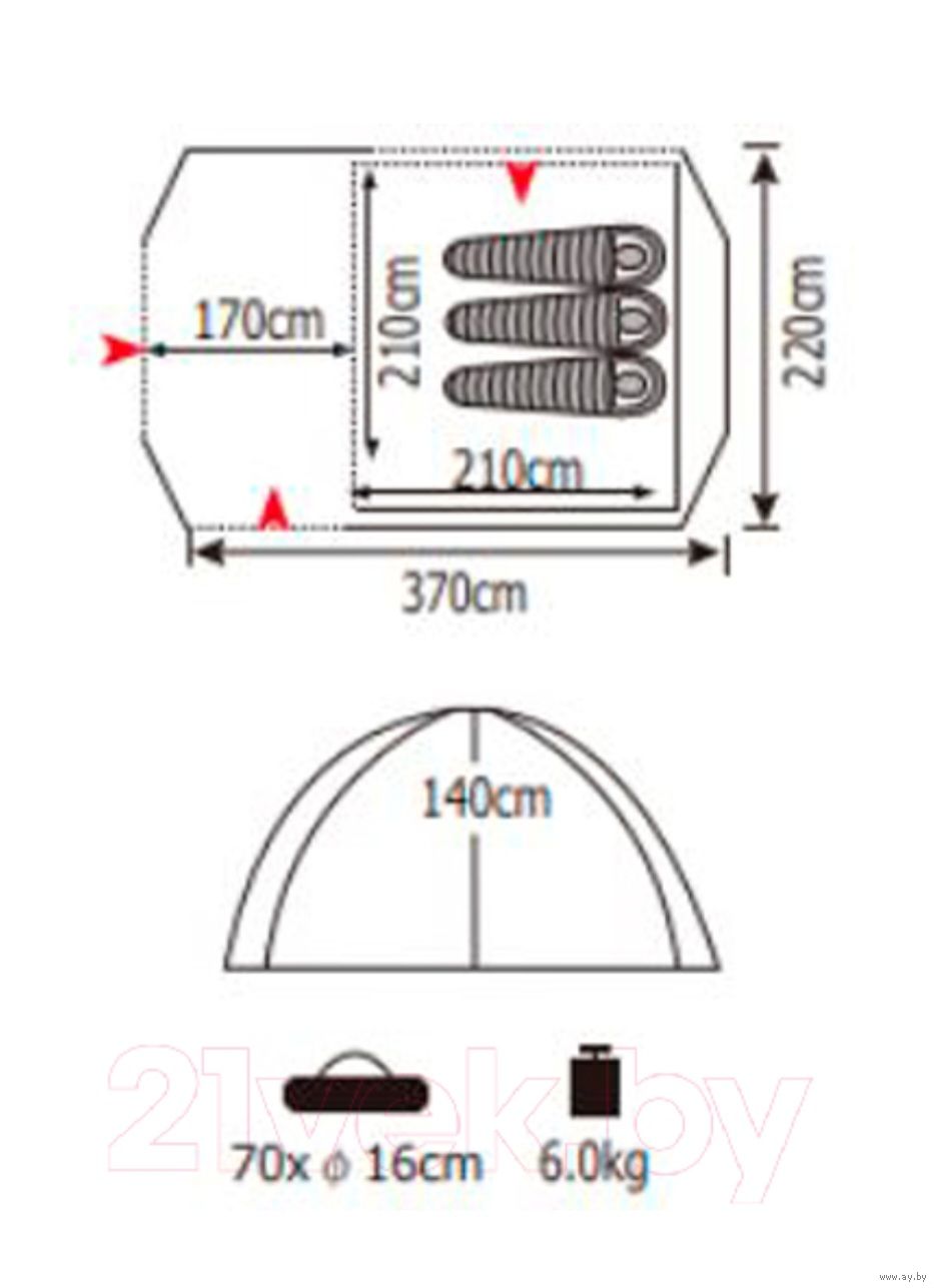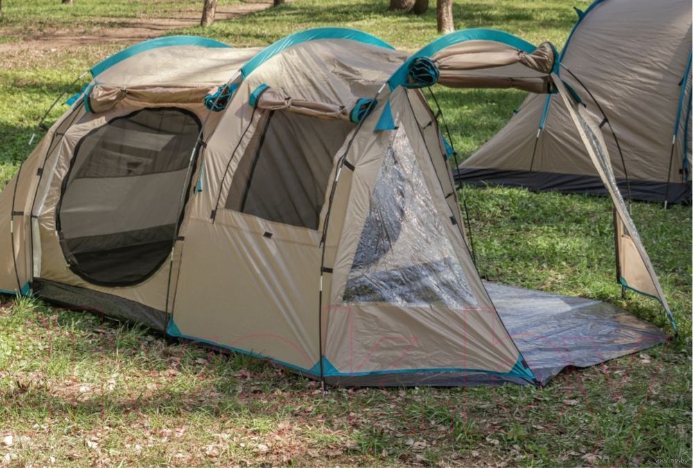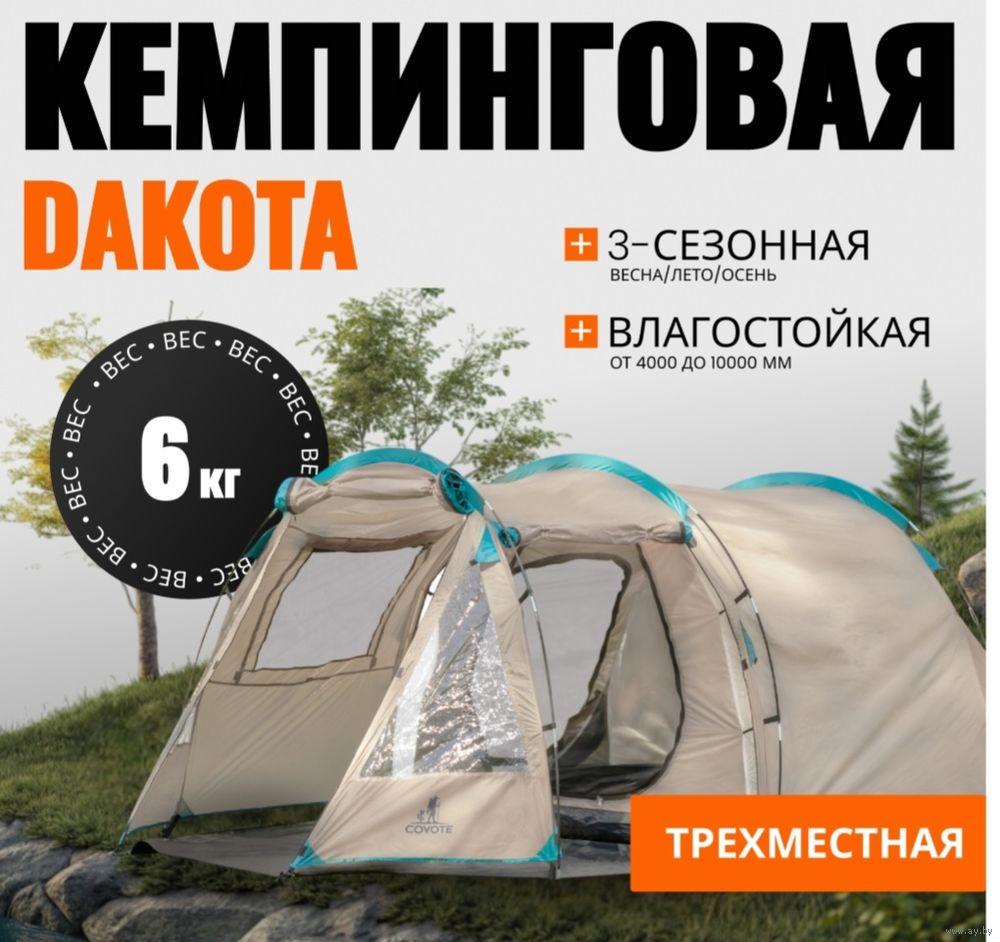 Большая палатка с тамбуром, полноценная трёшка. В тамбуре пристёгивается пол. Плотная непроиокаемая ткань тента, пол не промокнет даже если палатка стоит в луже. Качество хорошее, быстрая сборка даже неопытным. Новая, полный комплект.