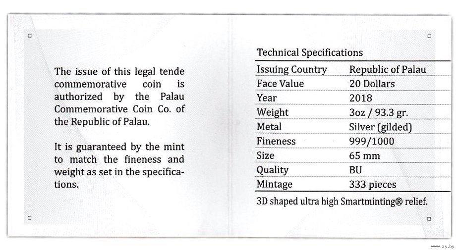 Качество: Proof; Coloured, Gold-plated; 3D High relief (Smartminting).