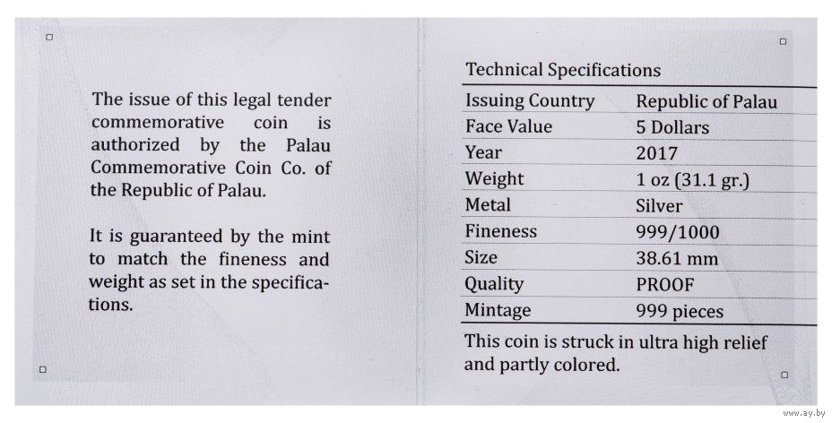 Качество: Proof; High relief (Smartminting), Bright coloring.