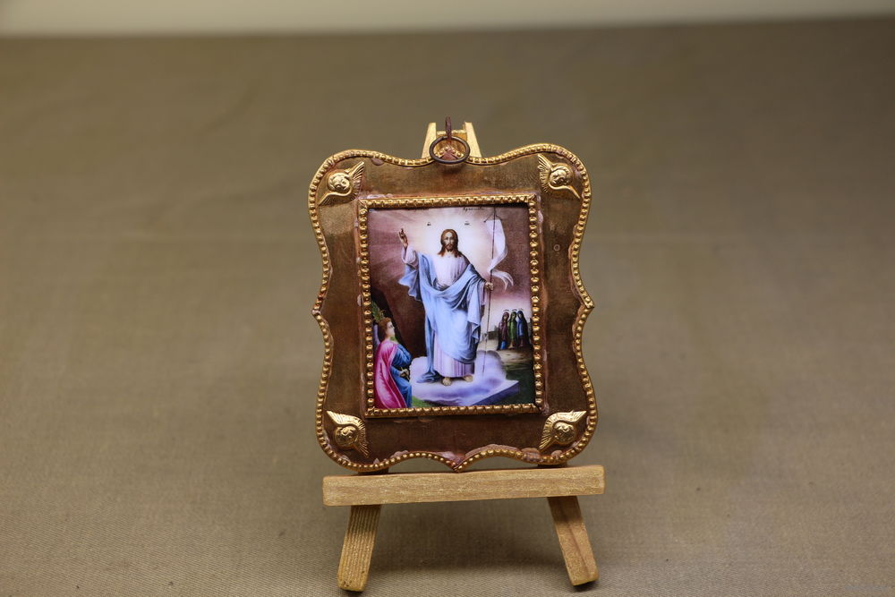Подвесная икона в фигурном окладе на бархатной подложке.