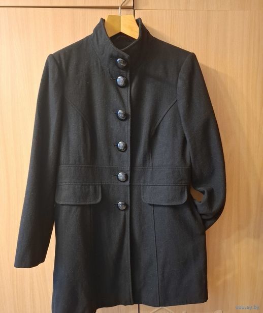 Фото 1-2. Черное пальто 46-48-50 размера со стоечкой, 52 % шерсти. По бокам карманы.