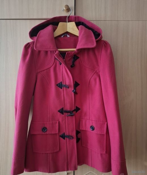 Фото 3-4. Пальто малинового цвета. Ткань очень приятная на ощупь, похожа на флис. На замке и пуговицах (1 пуговица сломана).