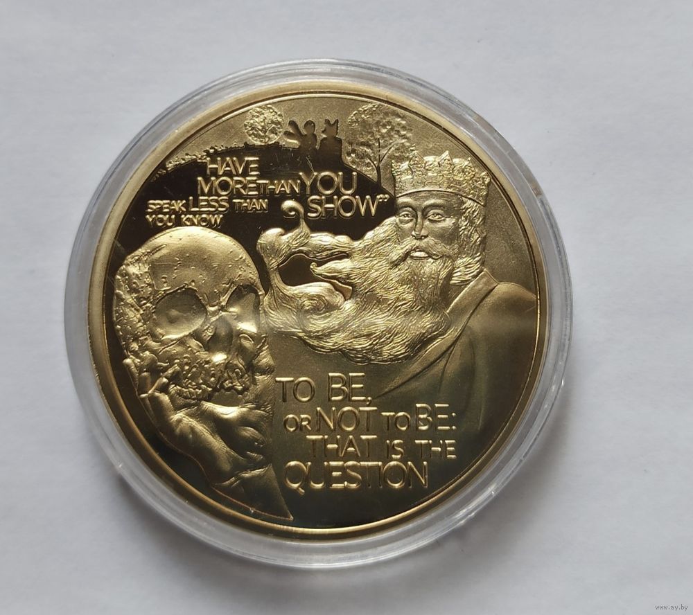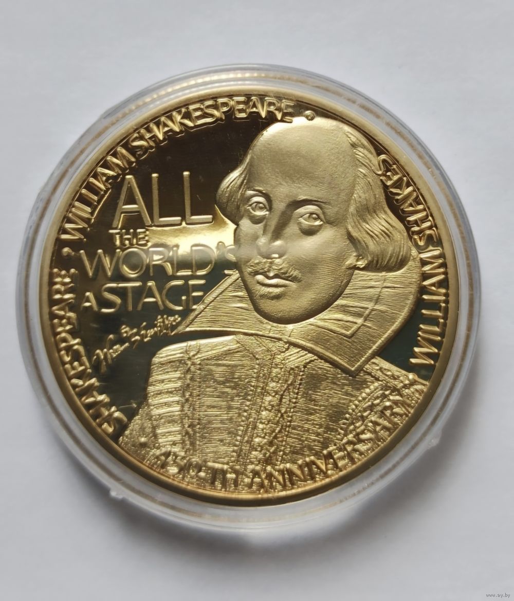 Памятная сувенирная медаль(монета, слиток), посвящённая 450 летию Уильяма Шекспира. Капсула. Металл жёлтого цвета. Возможен обмен.