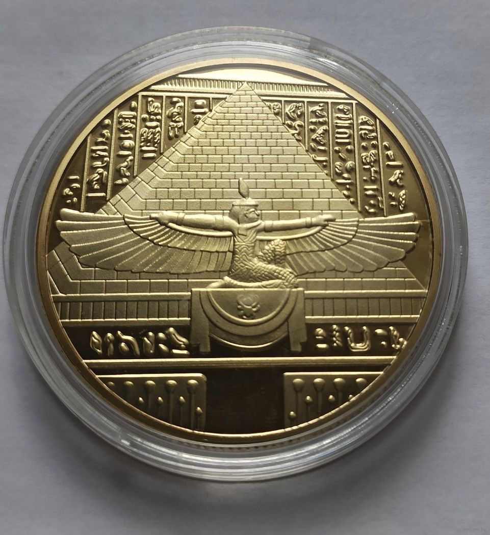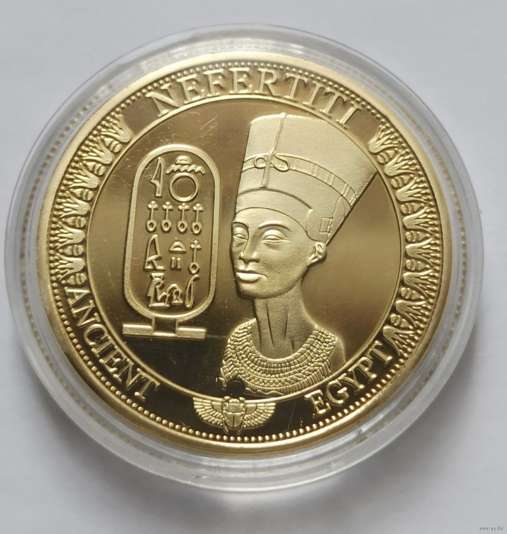 Медаль(монета, слиток), посвященная древнеегипетской царице Нефертити и египетской истории ( мифологии). Капсула. Сувенир. Металл жёлтого цвета. Возможен обмен.