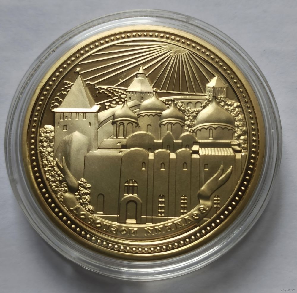 Памятная сувенирная медаль (монета, слиток), посвященная Софийскому Собору и Новгородскому Кремлю в Великом Новгороде. Капсула. Металл жёлтого цвета. Возможен обмен.