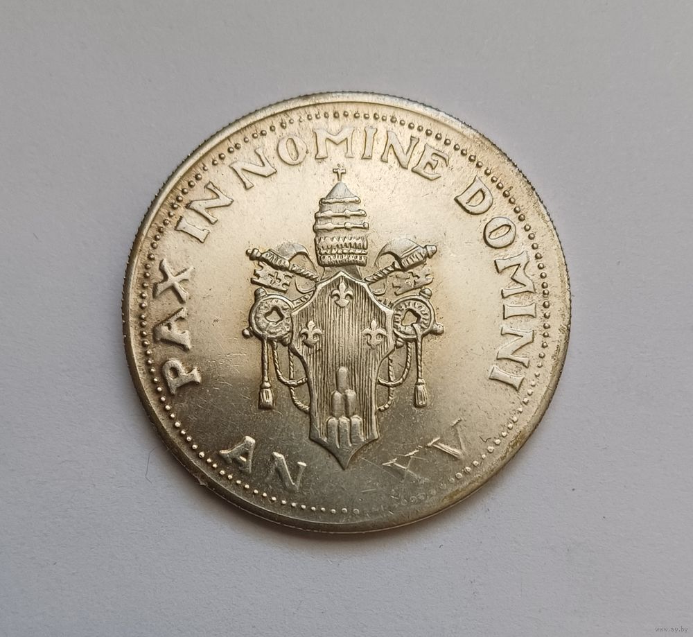 Медаль с изображением Иоанна Павла II и гербом Иоанна Павла VI. Относится к памятным выпускам, связанным с переходным периодом или годовщинами, учитывая, что Иоанн Павел II правил с 1978 по 2005 г.г. Римская цифра " XV" может указывать на 15-й год понтификата (примерно 1993-1994г.г.) или 15-летие какого-либо события. Прямая связь с Иоанном Павлом VI (1963-1978 г.г.) указывает на преемственность. Точный период выпуска такого типа медалей - конец 20 века (период с 1979 по 2000-е г.г.).