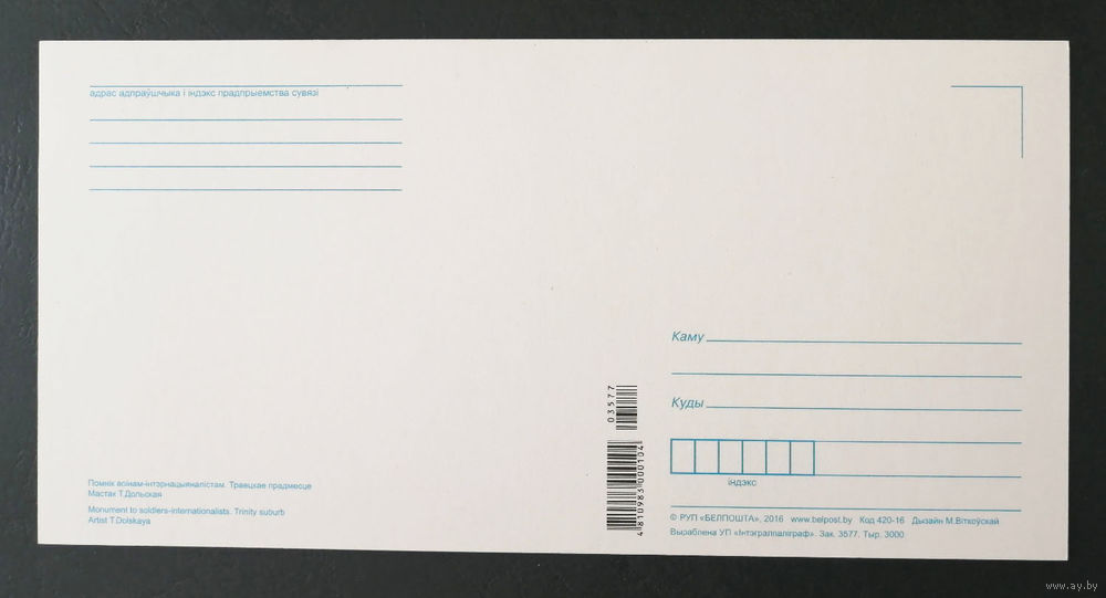 Оплата: наличные, P2P перевод на банковскую карту. Стоимость почтового отправления по РБ весом до 100 гр., обычный конверт - 4 руб. 50 коп., пластиковый конверт или коробка Белпочта, весом до 1 кг. - 6 руб. Оформление - "До востребования"