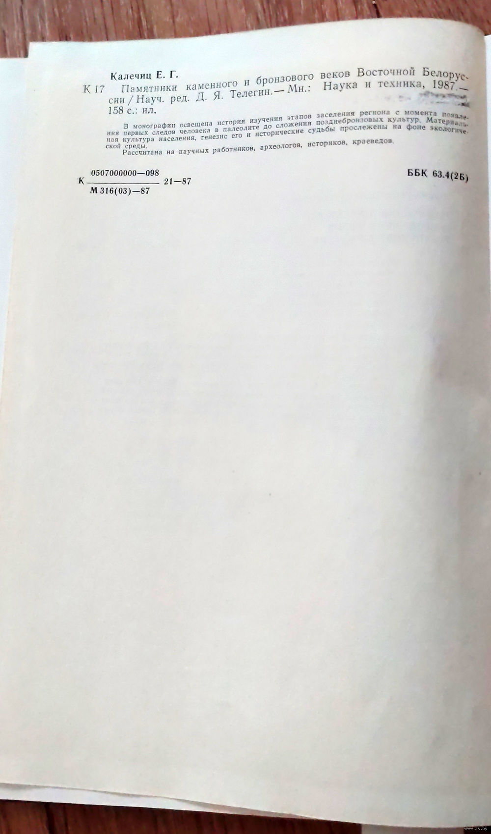 "Памятники каменного и бронзового веков Восточной Белоруссии" (1987) — монография Е.Г. Калечиц, систематизирующая археологические стоянки, поселения и находки. В работе описаны стоянки эпохи мезолита-неолита, кремнеобрабатывающие мастерские Верхнего Поднепровья и памятники бронзового века, свидетельствующие о появлении ранних металлических изделий.