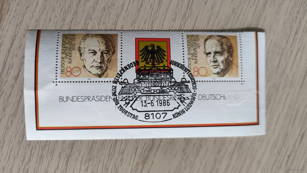 Спецгашение (центральный штамп): Штамп датирован 13 июня 1986 года и посвящен 100-летию со дня смерти короля Людвига II Баварского (König Ludwig II. - Gedenkfeier zum 100. Todestag). На штампе изображен замок Линдерхоф и герб Баварии.