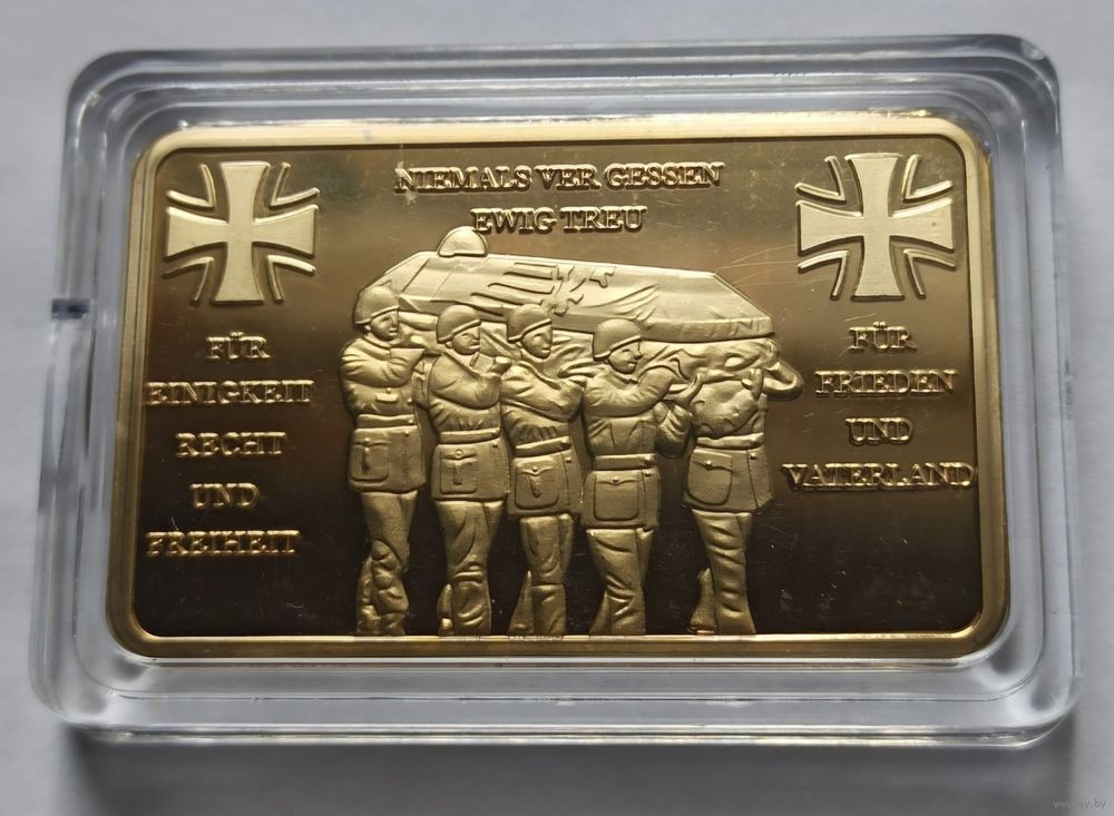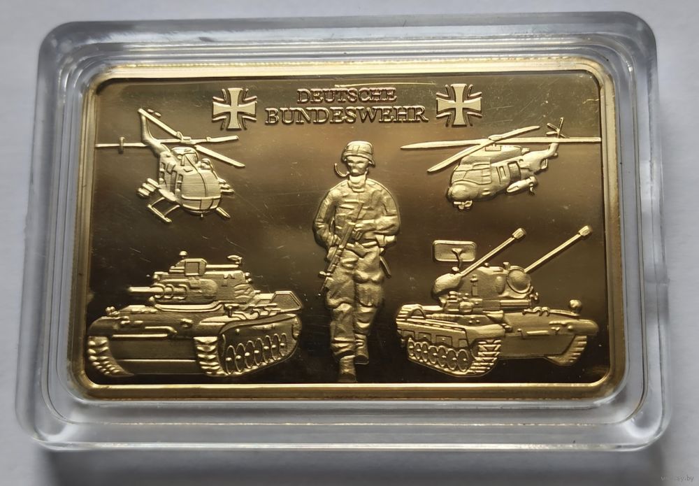 Памятный ( сувенирный) слиток, посвящённый Бундесверу. Металл жёлтого цвета. Капсула. Возможен обмен.
