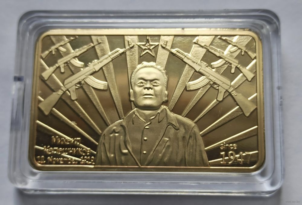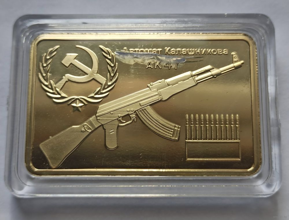 Памятный ( сувенирный) слиток, посвящённый конструкторы оружия Михаилу Калашникову и АК-47. Капсула. Металл жёлтого цвета. 2,5 на 4 см. Возможен обмен.