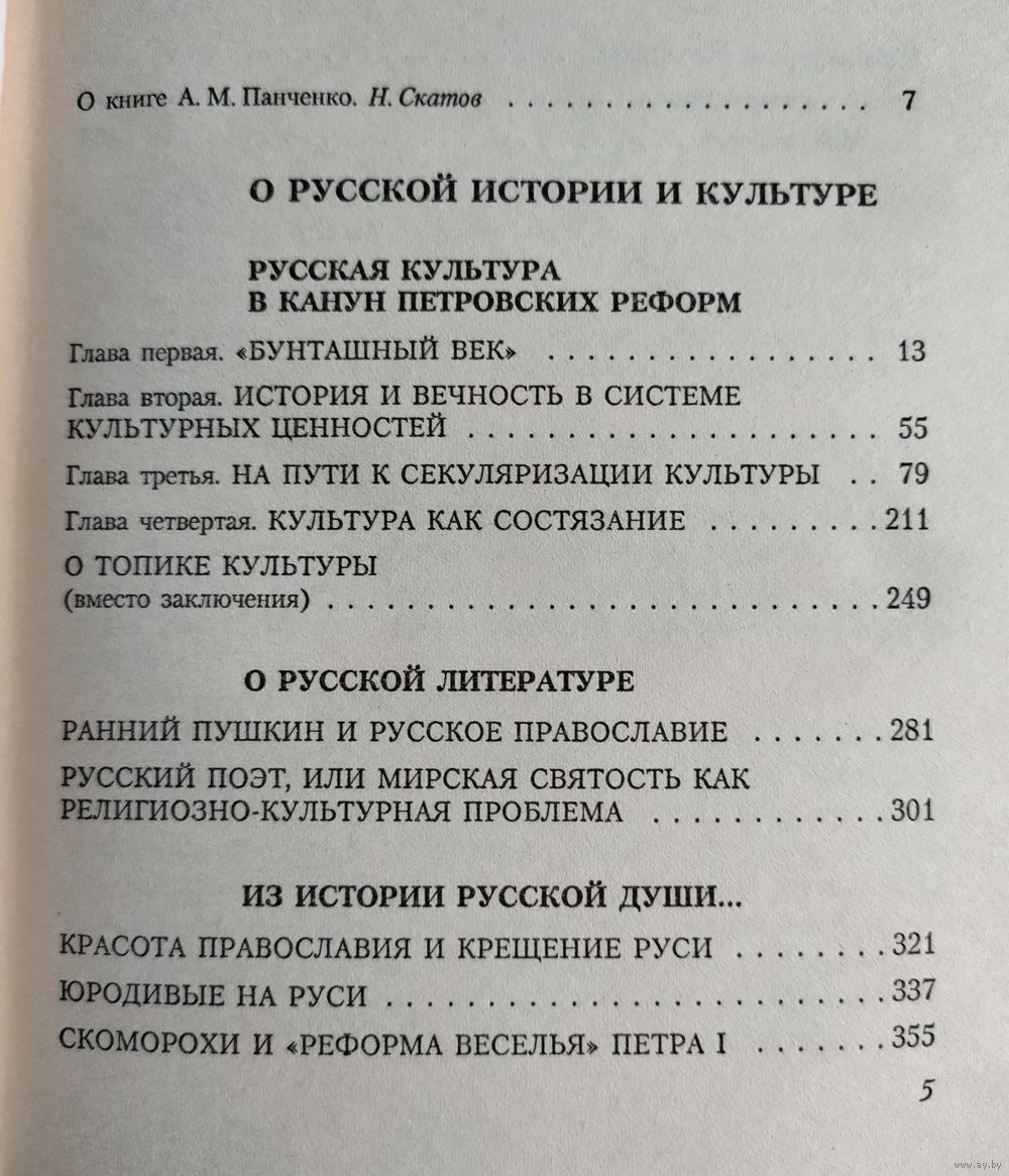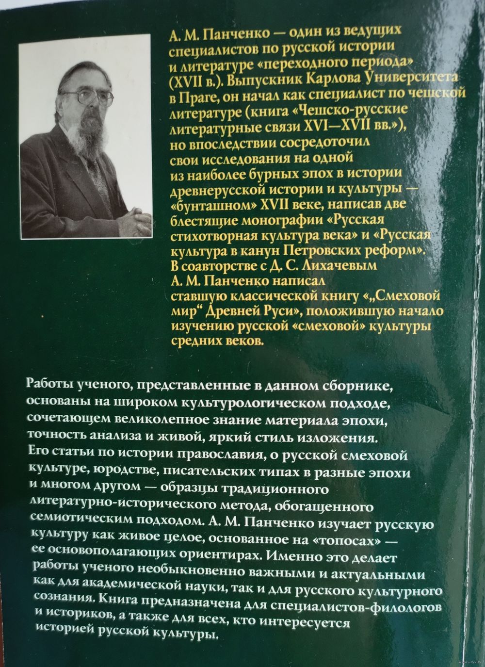 А.М.Панченко - один из ведущих специалистов по русской истории и литературе `переходного периода` (XVII в.). Его исследования одной из самых бурных эпох в истории древнерусской истории и культуры - `бунташного` XVII века - стали классическими - это монографии `Русская стихотворная культура XVII века` и `Русская культура в канун Петровских реформ`. Работы, представленные в данном сборнике, основаны на широком культурологическом подходе, сочетающем блестящее знание материала эпохи, точность анализа и живой, яркий стиль изложения. А.М.Панченко изучает русскую культуру как живое целое, основанное на `топосах` - ее основополагающих ориентирах. Именно это делает работы ученого необыкновенно важными и актуальными как для академической науки, так и для русского культурного сознания. Книга предназначена для специалистов-филологов и историков, а также для всех, интересующихся историей русской культуры.