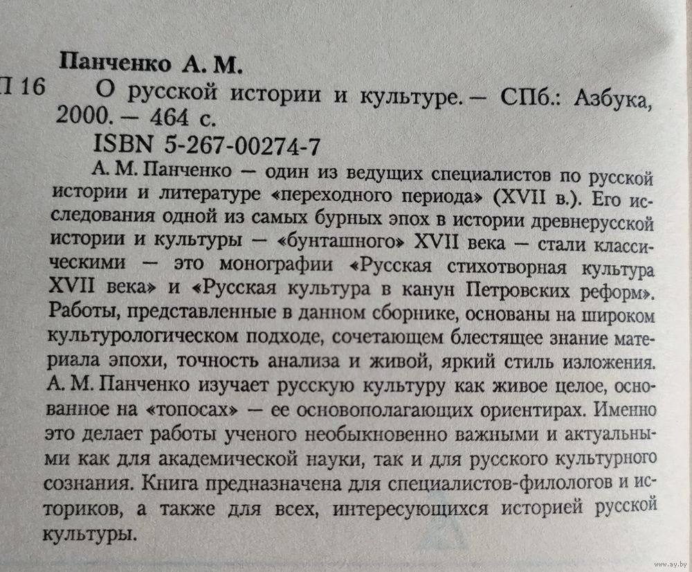 Панченко А. О русской истории и культуре. Серия: Academia. СПб.: Азбука, 2000г., 464с. Бумажный переплет. Обычный формат.