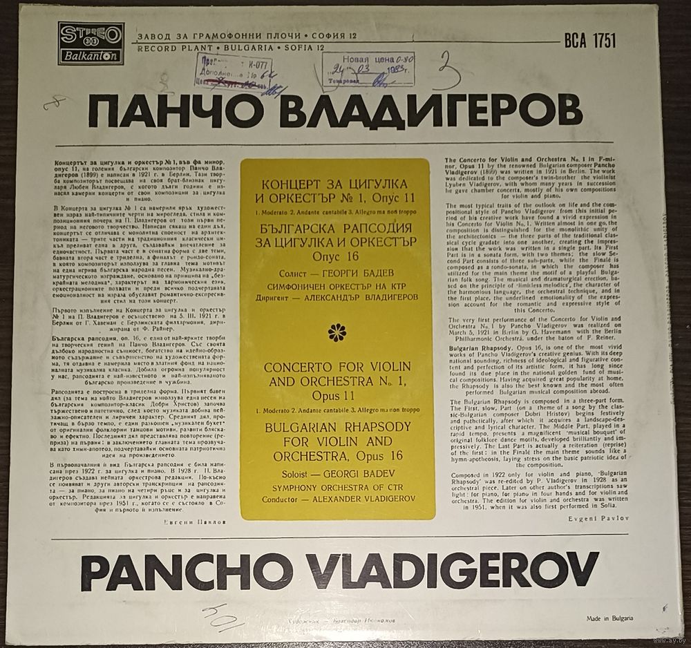 Pancho Vladigerov – Concerto For Violin And Orchestra No. 1 / Bulgarian Rhapsody For Violin And Orchestra.