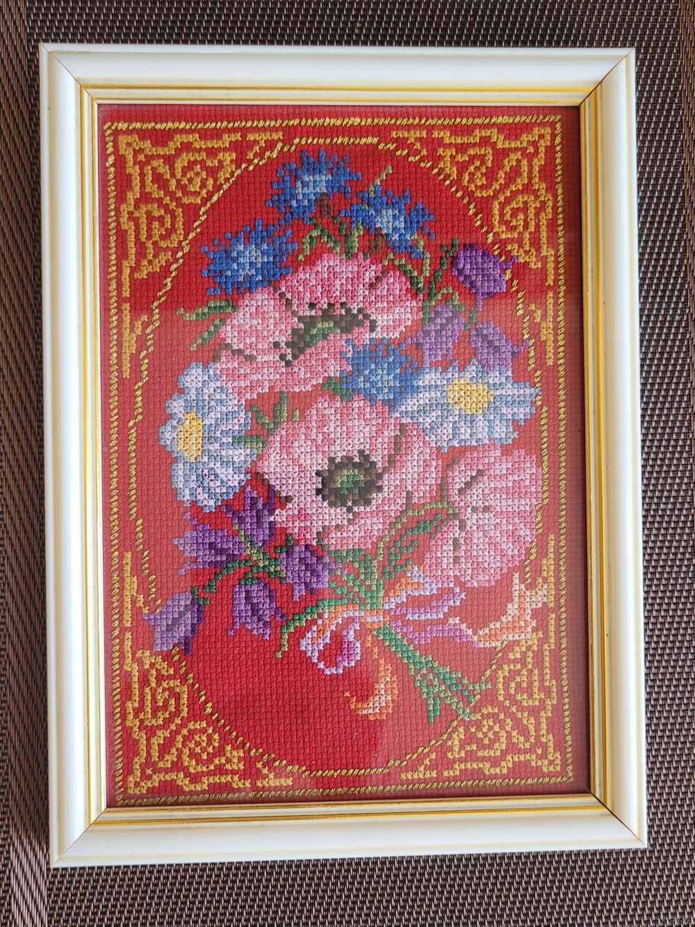 Букет, ручная вышивка крестом, в рамке под стеклом. Размер панно 23×17 см.