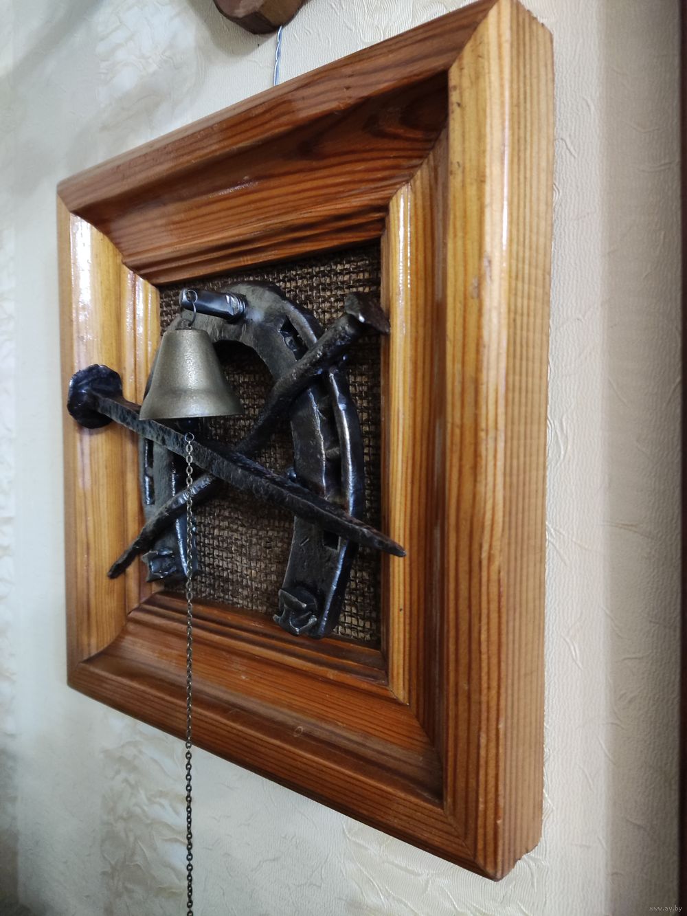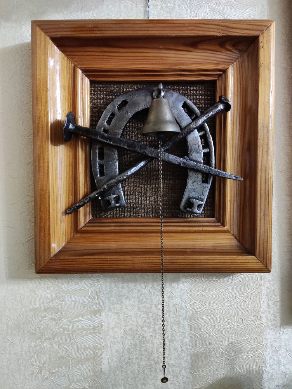 Панно. Колокольчик придверный, оберег. Инсталляция. Старинная ковка (подкова, гвозди). Латунный звонкий поддужный колокольчик. Рамка сосна. Высота 250 мм, ширина 250 мм, диаметр юбки колокольчика 48 мм.