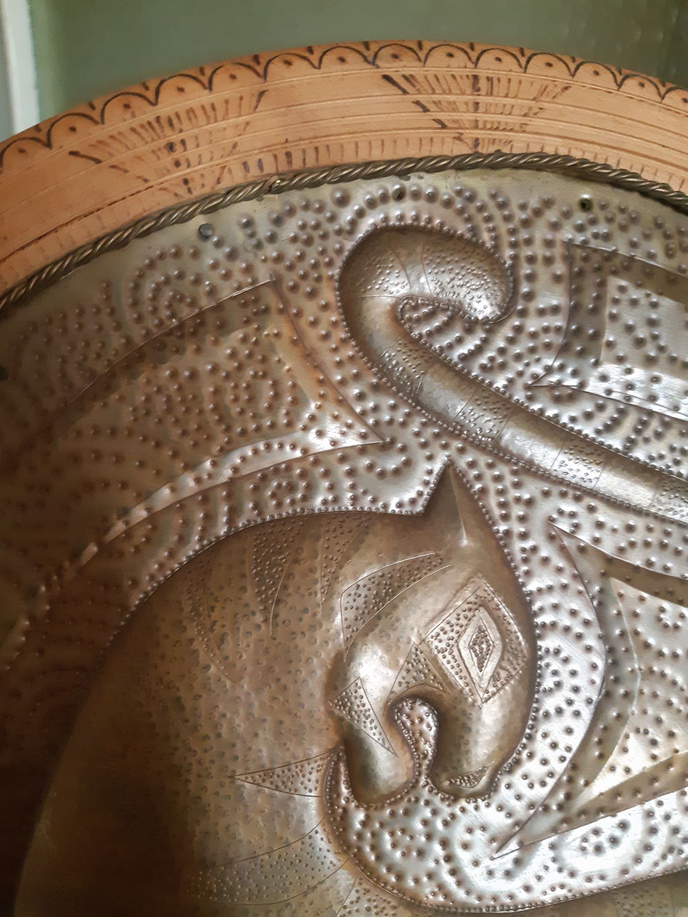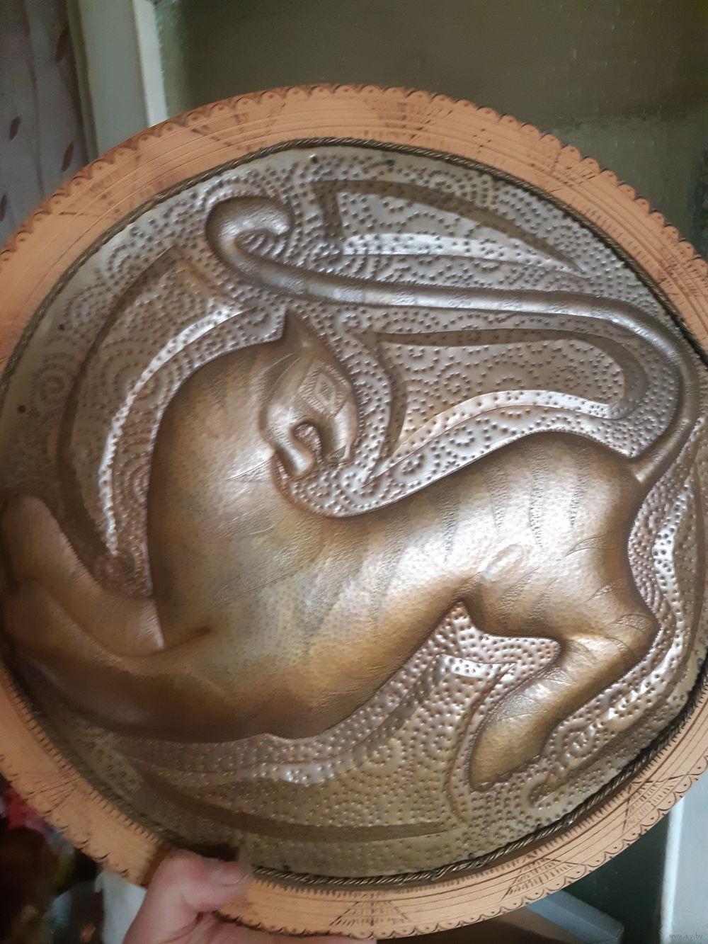 Большая, диаметр 36см, в ширину 3 см. Дерево + латунь или бронза. Эксклюзивная вещь.