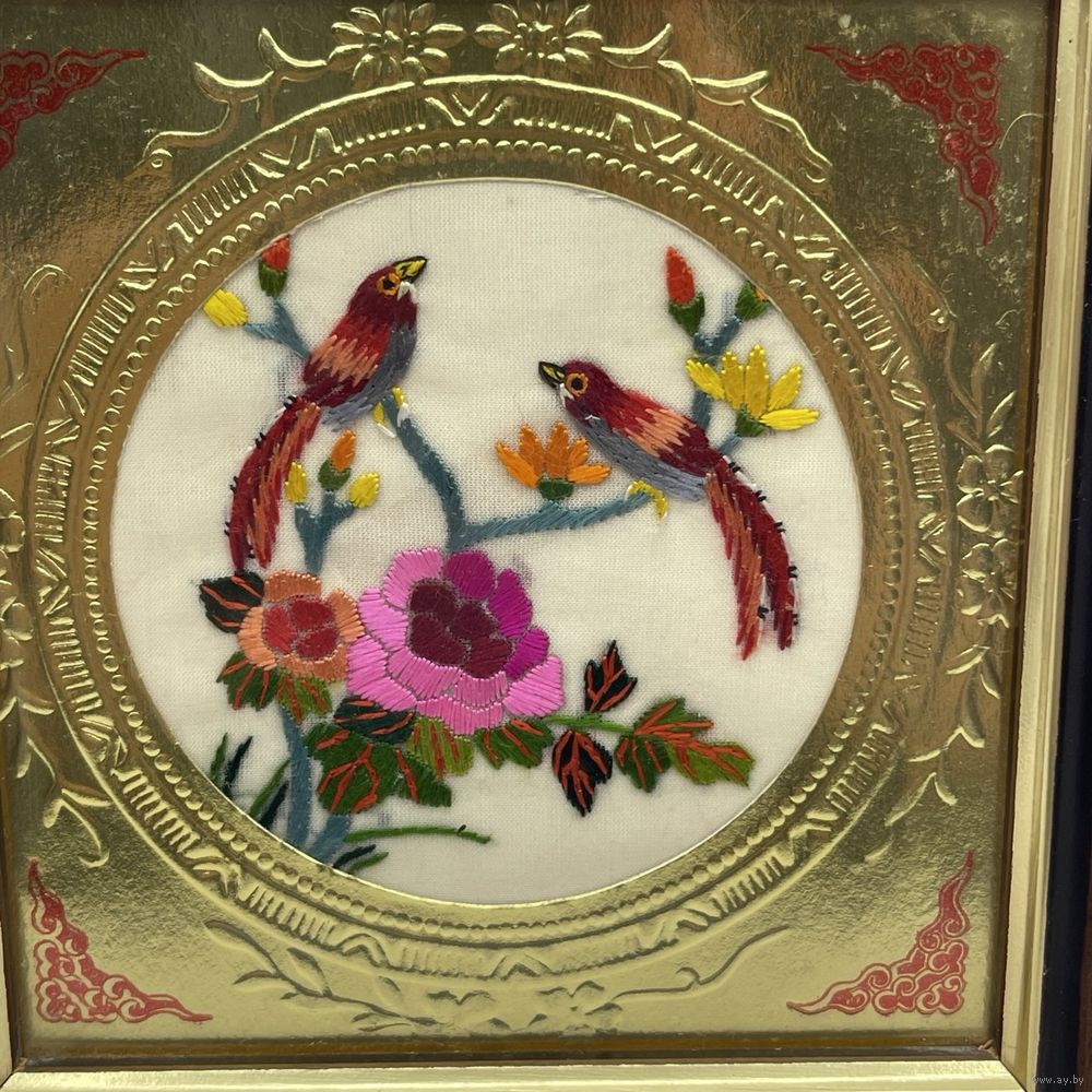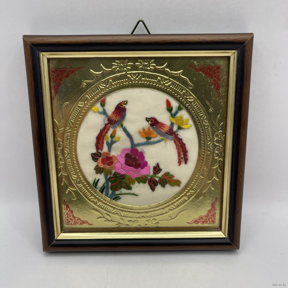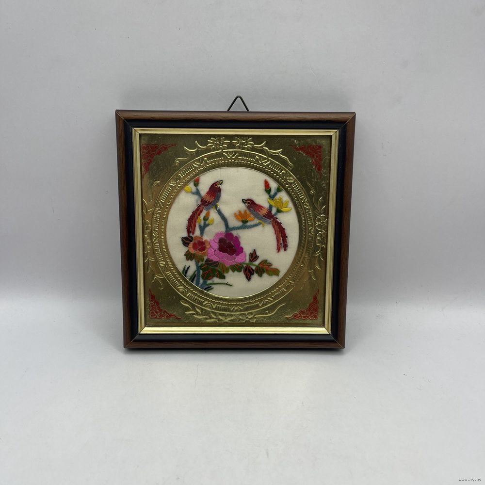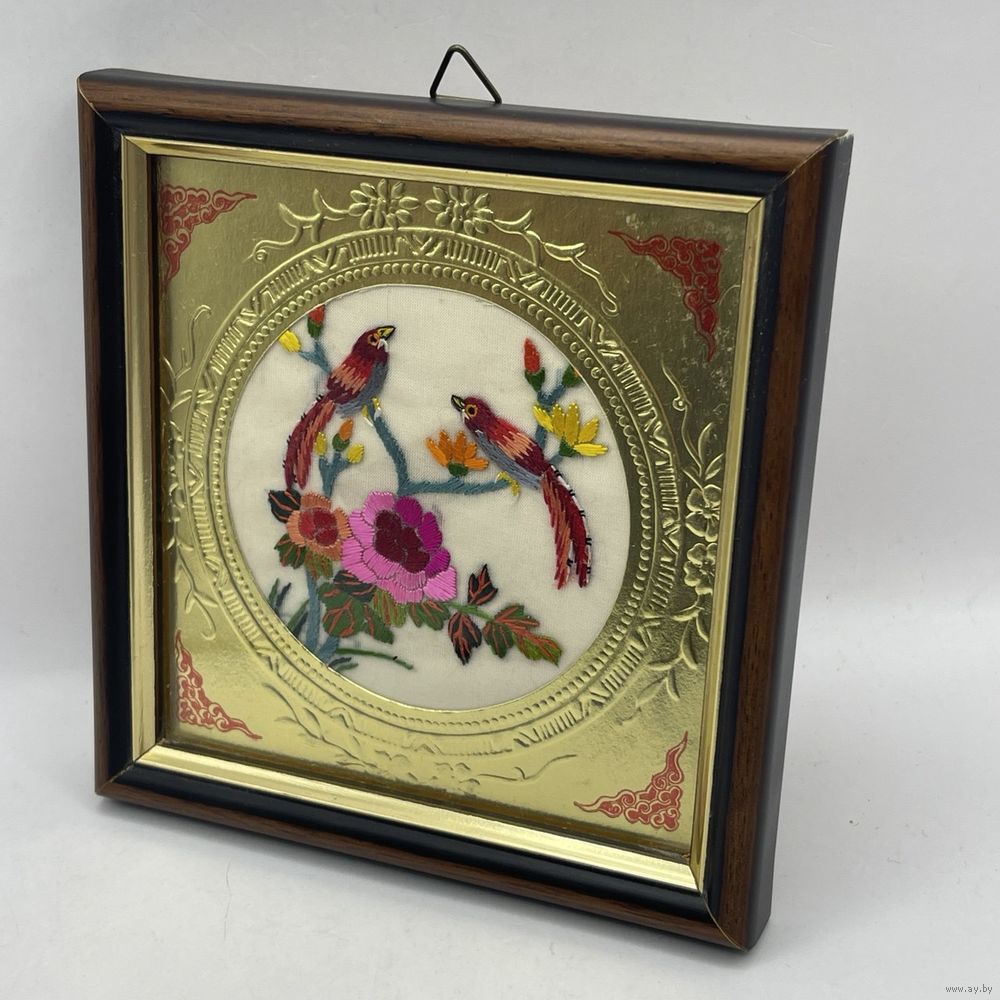 Винтажное панно ручной работы в китайском стиле с шелковым изображением райских птиц в цветах тонкой ручной вышивки, обрамленным тисненой золотой фольгой. В деревянной раме ручной работы, под стеклом. Италия. 1950-е г.г. Размер 12,5 х 12,5 см. С подвесом. Сохранен маркировочный стикер художественной мастерской.