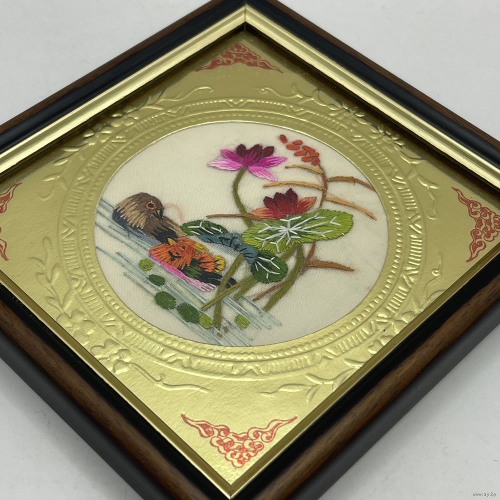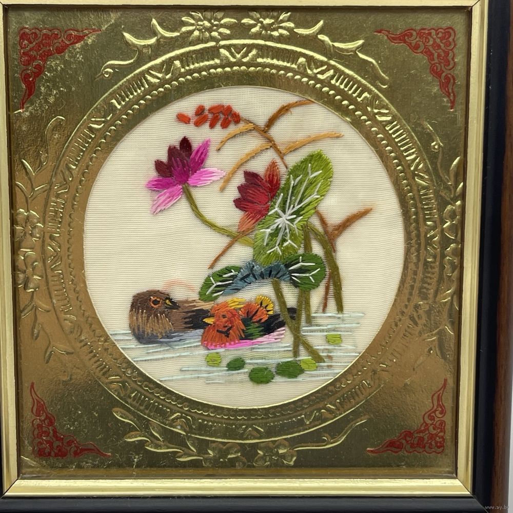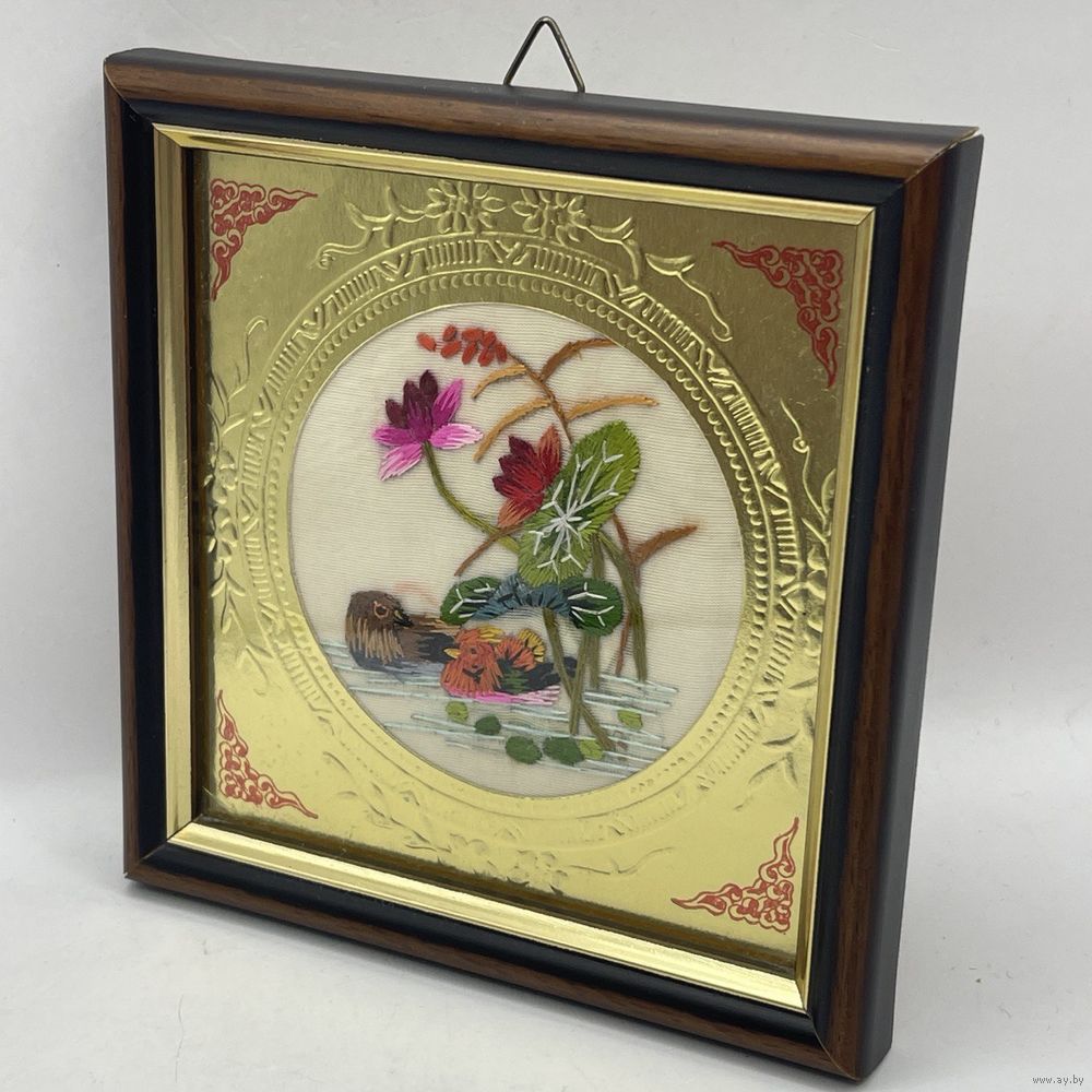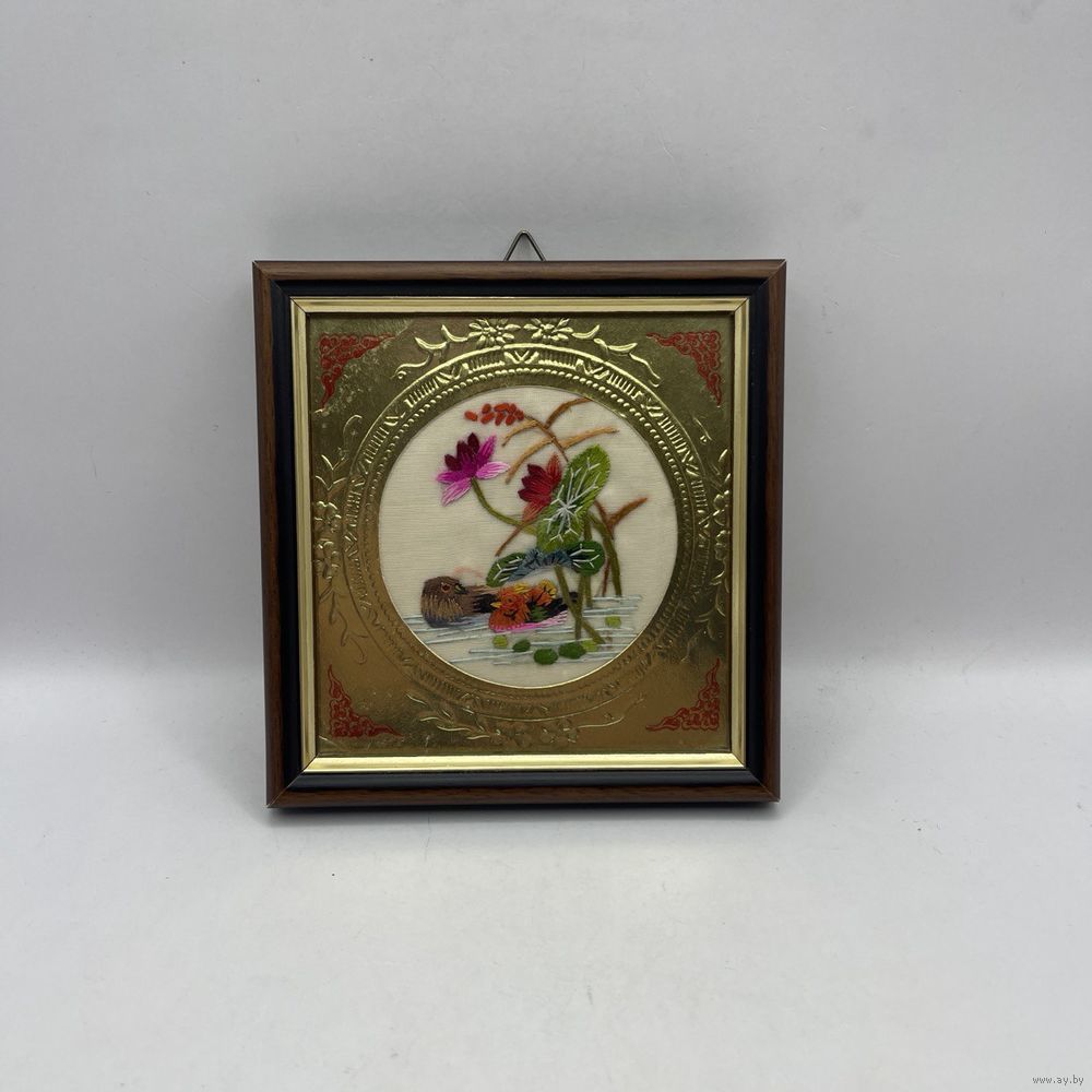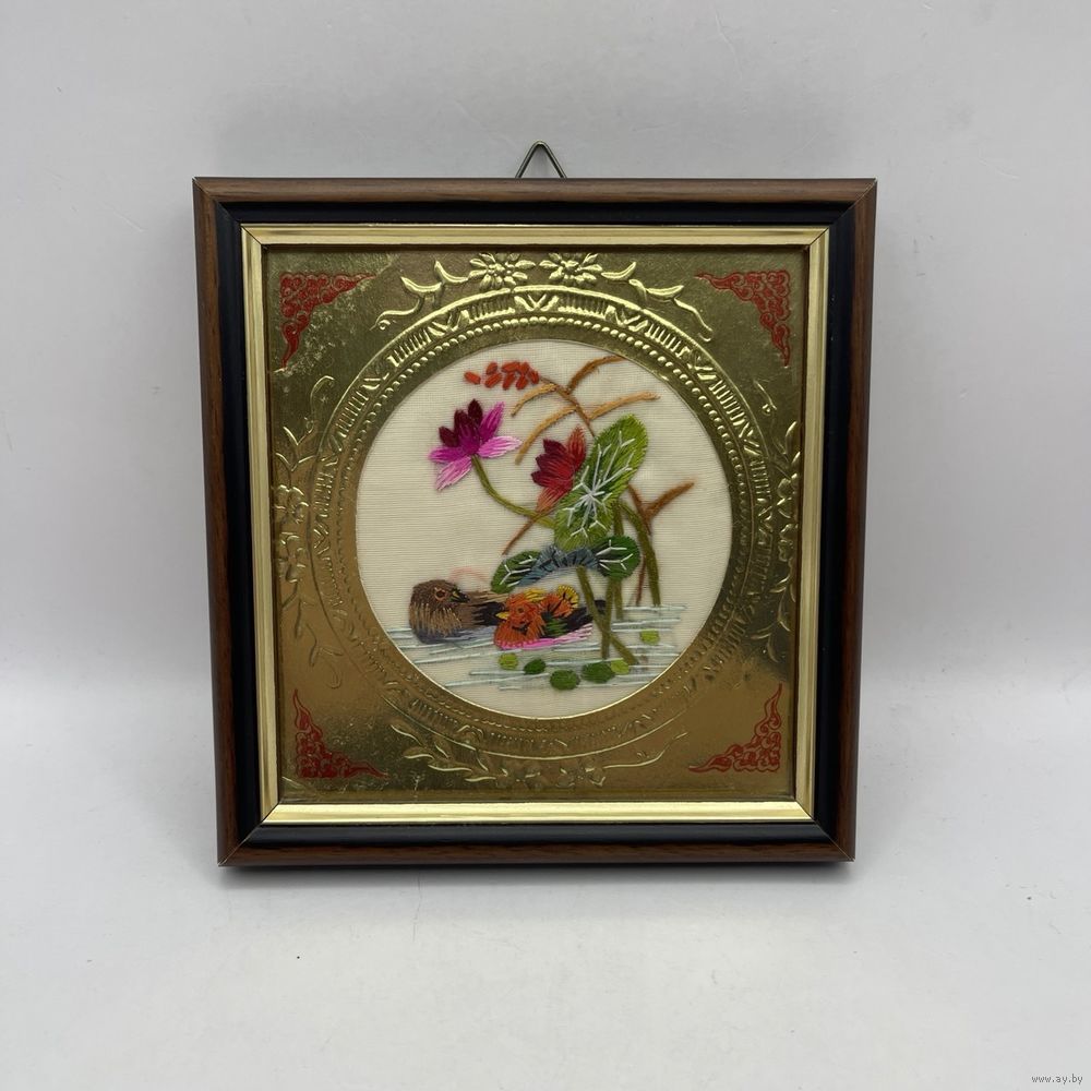 Винтажное панно ручной работы в китайском стиле с шелковым изображением уток-мандаринок в цветах лотоса тонкой ручной вышивки, обрамленным тисненой золотой фольгой. В деревянной раме ручной работы, под стеклом. Италия. 1950-е г.г. Размер 12,5 х 12,5 см. С подвесом. Сохранен маркировочный стикер художественной мастерской.