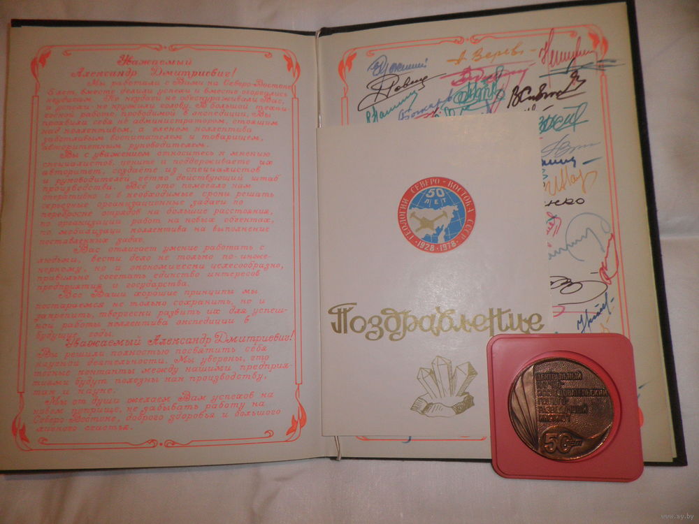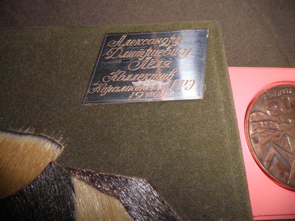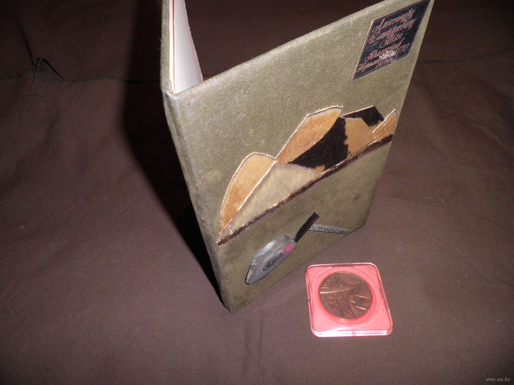 Папка выполнена из кусочков меха животных(олень и др) и украшена натуральными полудрагоценными камнями(агат,яшма и др.)Поздравление с 50-летием Геологии Северо-Востока СССР.