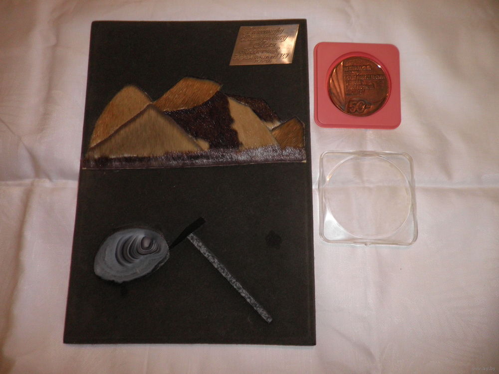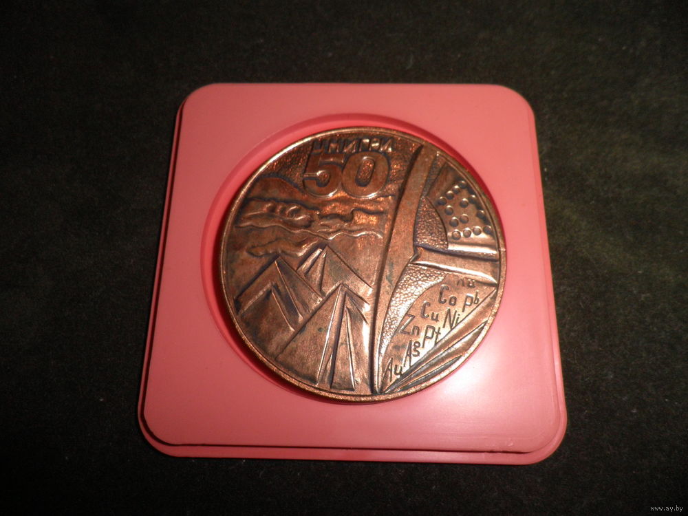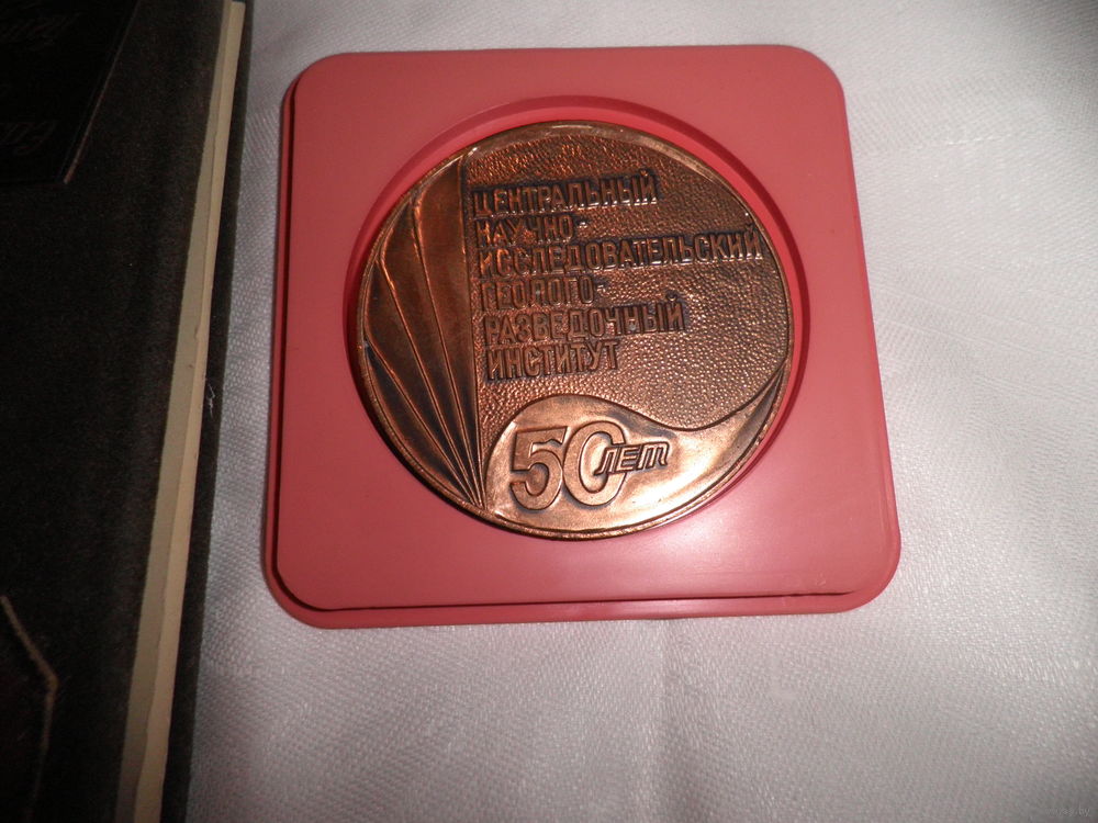 Медаль бронзовая,диаметр 60 мм,вес 117 гр.В коробке.Посвещена 50-летию ЦНИГРИ(Центральный научн-оисследовательский геологоразведочный институт.