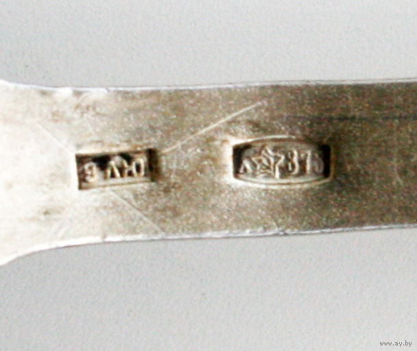 Клеймо Ленинградкой инспекции пробирного надзора "875" с эмблемой серп и молот на фоне пятиконечной звезды, клеймо-именник "9ЛЮ" - Ленинградский ювелирная фабрика.